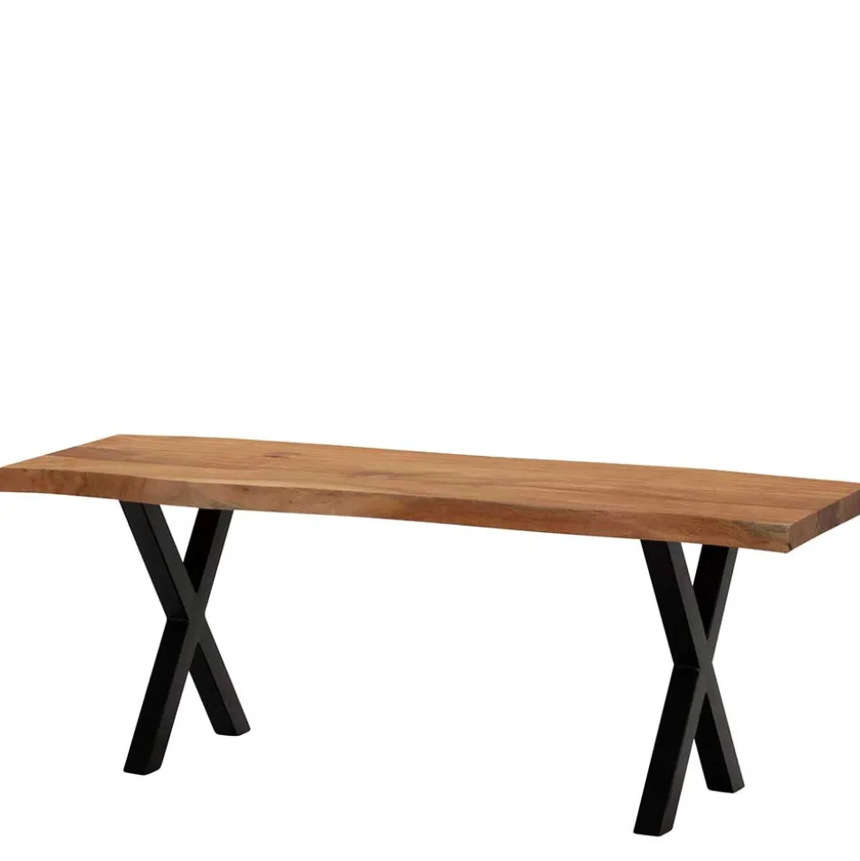Die Sitzfläche der „Nariosca“ Garderobenbank besteht aus massivem Akazienholz. Besonders beeindruckend ist die unregelmäßige Baumkante, die das Holz auszeichnet – als wäre es direkt aus dem Stamm geschnitten. Diese einzigartige Optik wird durch eine schützende Lackierung perfekt in Szene gesetzt, die zudem für eine langlebige und pflegeleichte Oberfläche sorgt. Das robuste Untergestell aus schwarzem Metall, geformt in einem markanten X-Design, bietet nicht nur Stabilität, sondern ergänzt den natürlichen Charme des Holzes durch einen modernen, industriellen Touch.