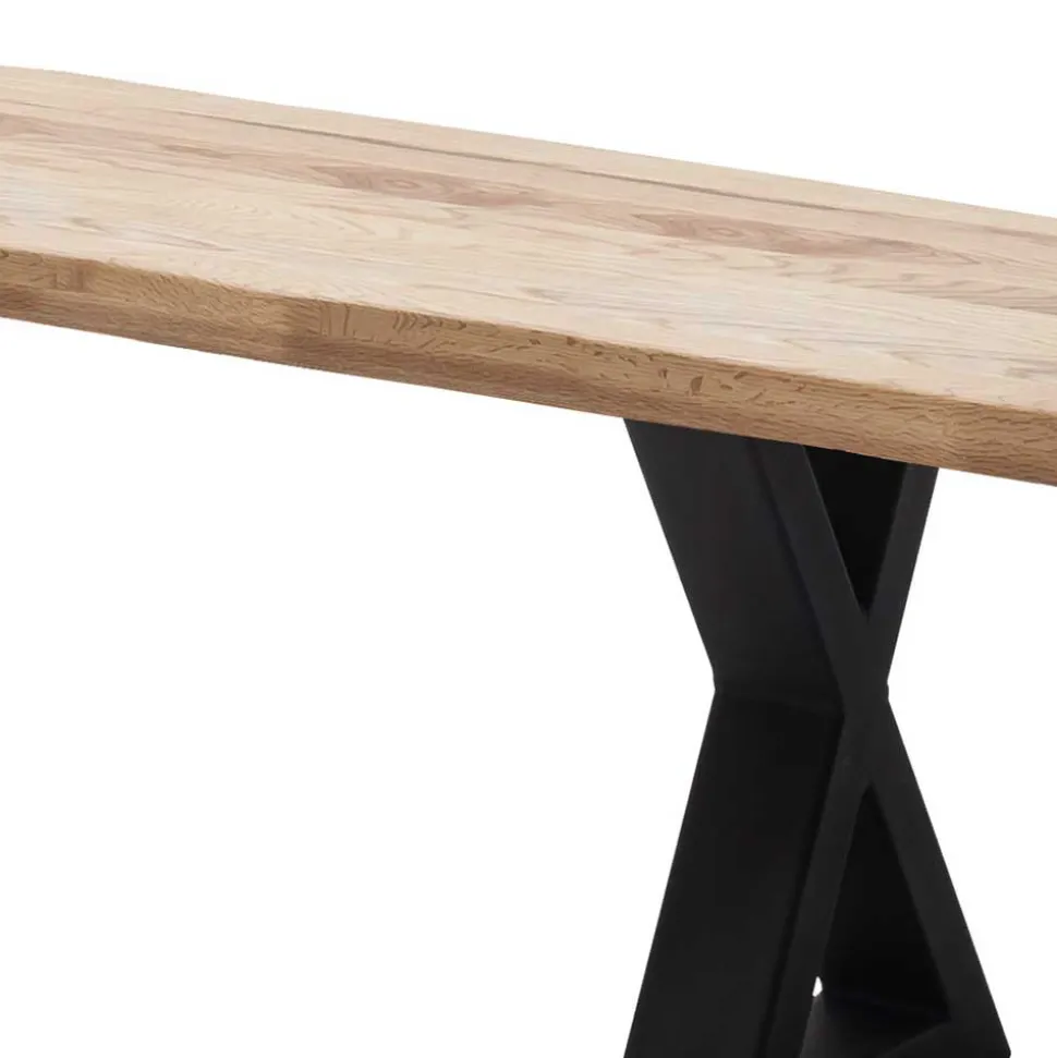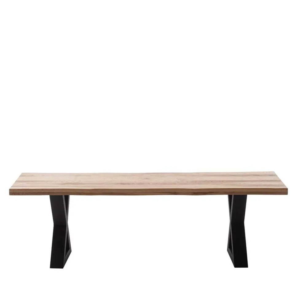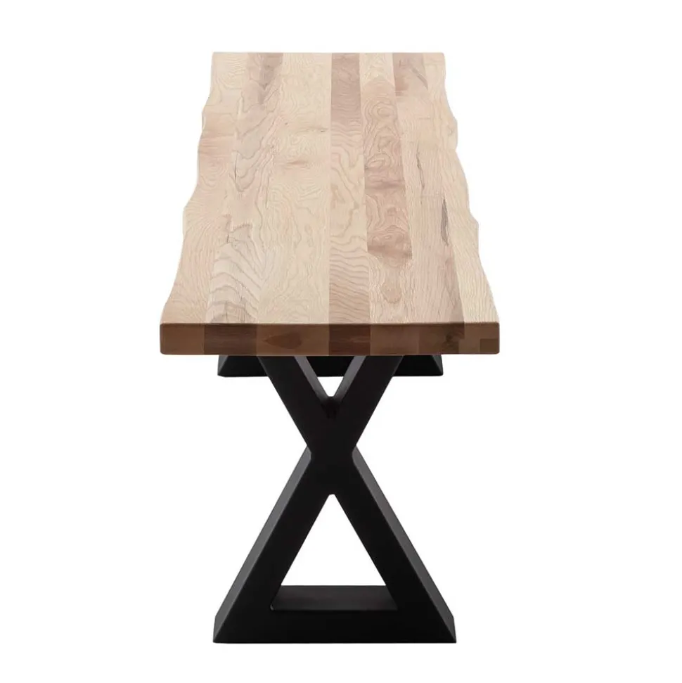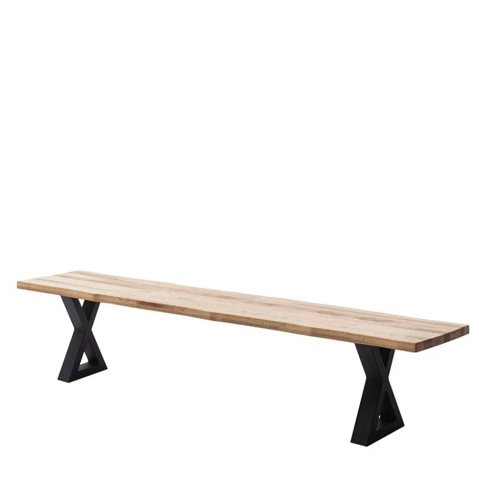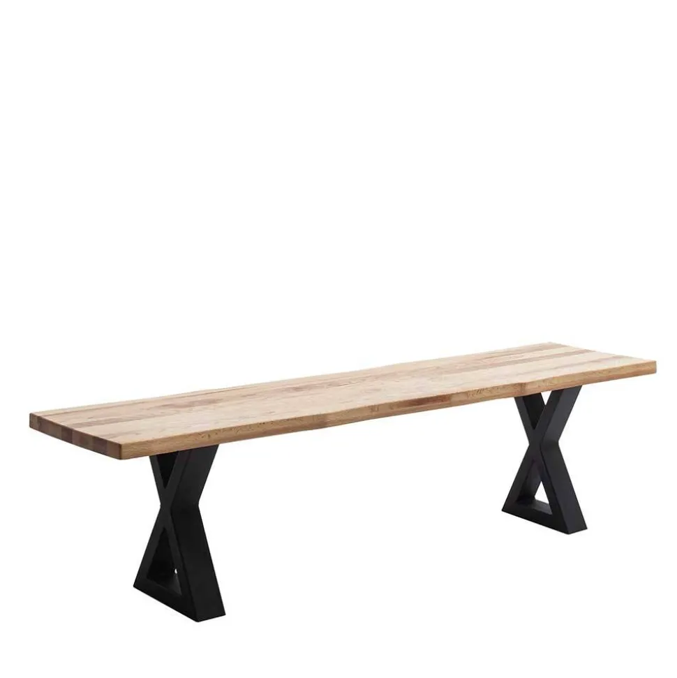 Die Sitzfläche der „Lagon“ besteht aus massiver Zerreiche und beeindruckt durch die durchgehende Lamellenverarbeitung, die nicht nur für Stabilität, sondern auch für eine besonders edle Optik sorgt. Die geölte Holzoberfläche verleiht der Bank eine natürliche Ausstrahlung und schützt das Holz gleichzeitig vor äußeren Einflüssen. Besonders hervorzuheben ist die einzigartige Baumkante, die direkt aus dem Stamm geschnitten wurde und jedes Stück zu einem Unikat macht. Die robusten Metallbeine in X-Form sind schwarz pulverbeschichtet und bieten einen sicheren Stand.