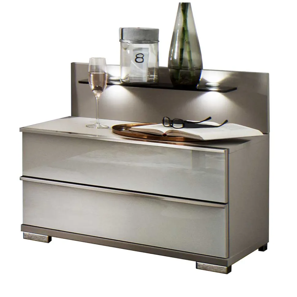 Ein herausragendes Feature der „Tumiva“ Nachtkonsole ist das innovative LED-Touch-Beleuchtungssystem am Rauchglasboden des aufgesetzten Wandpaneels. Mit nur einer Berührung können Sie eine sanfte, einladende Beleuchtung aktivieren, die eine entspannende Atmosphäre schafft, ideal zum Lesen oder Entspannen vor dem Schlafengehen.