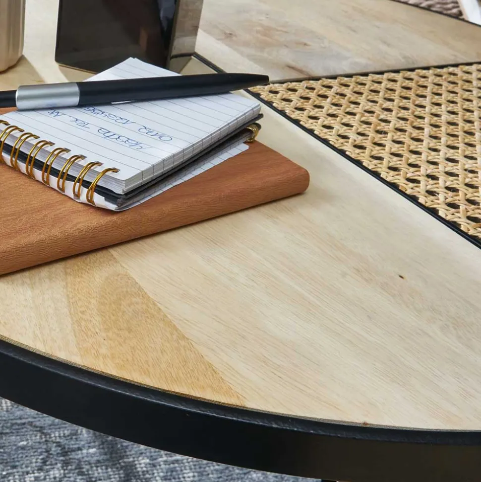 Die runden Formen der beiden Tische wirken harmonisch und elegant. Das größere Modell misst 60x37x60 cm, das kleinere 40x30x40 cm – beide lassen sich dank halbseitig offener Metall-Ringgestelle platzsparend ineinander schieben. Die Tischplatten kombinieren edles Mangoholz mit feinem Rattan-Geflecht, das für einen leichten, natürlichen Akzent sorgt. Mit einer Belastbarkeit von 15 kg beim großen Tisch und 10 kg beim kleinen ist das Set ebenso funktional wie dekorativ.