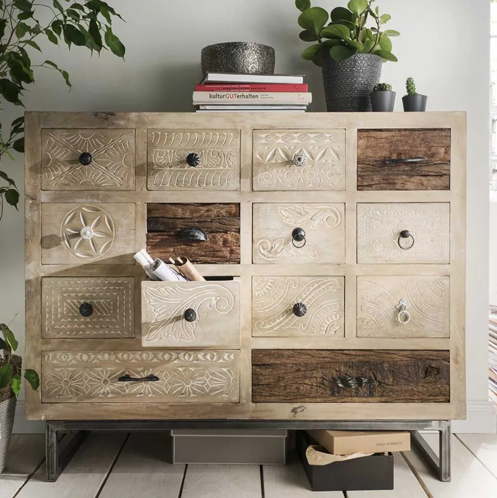 Die Holzoberfläche des Highboards ist mit einem White Wash Effekt behandelt, der dem Möbelstück eine zeitlose Eleganz verleiht. Die Schubladenfronten sind größtenteils mit wunderschönen Schnitzereien verziert, die das Highboard „Emirello“ zu einem wahren Kunstwerk machen.Der außergewöhnliche Look des Highboards „Emirello“ wird sicherlich alle Blicke auf sich ziehen und Ihrem Zuhause eine warme und einladende Atmosphäre verleihen.