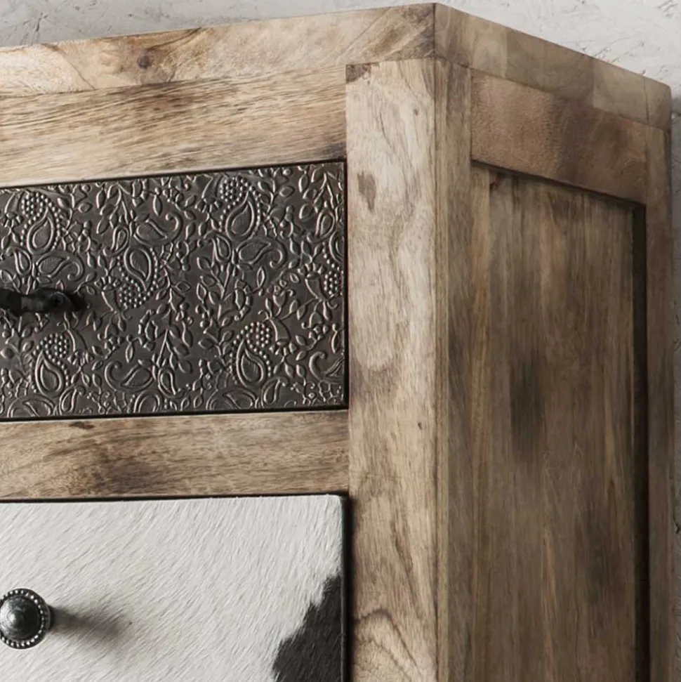 Jedes „Calcalero“ Highboard ist ein Meisterwerk handwerklicher Fertigung. Die Verwendung von massivem, recyceltem Mangobaumholz unterstreicht nicht nur die Nachhaltigkeit des Produktes, sondern betont auch die robuste und langlebige Qualität. Mangobaumholz ist bekannt für seine hohe Festigkeit und attraktive Maserung, was jedes Möbelstück zum unverwechselbaren Unikat macht.