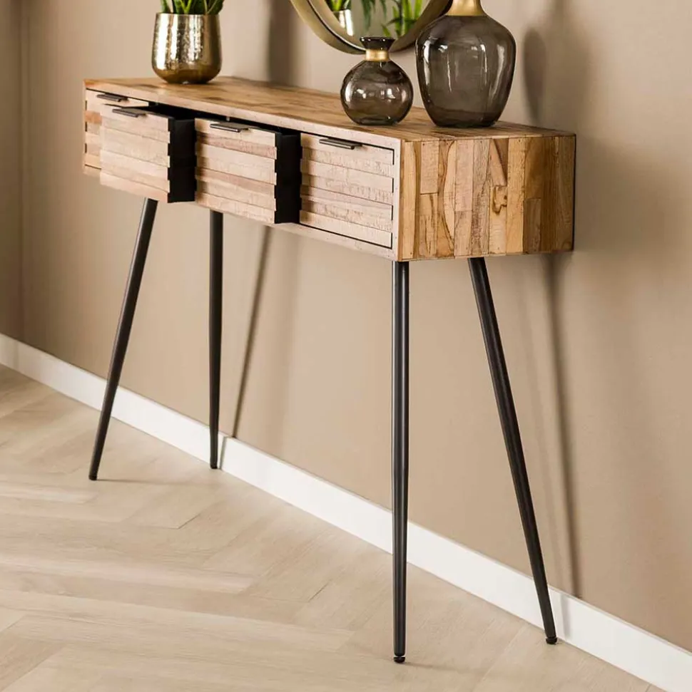 Ein modernes Zuhause braucht Möbel, die Funktionalität und Design perfekt miteinander verbinden. Der Konsolentisch Fire bringt genau das in Ihre vier Wände. Er überzeugt nicht nur durch seine hochwertige Verarbeitung, sondern auch durch seinen unvergleichlichen Look im angesagten Industry- und Loft-Stil. Dieser Stil zeichnet sich durch eine Kombination aus robusten Materialien, klaren Linien und einer Prise Vintage-Charme aus – ideal, um Ihrem Wohnraum Charakter und Persönlichkeit zu verleihen.