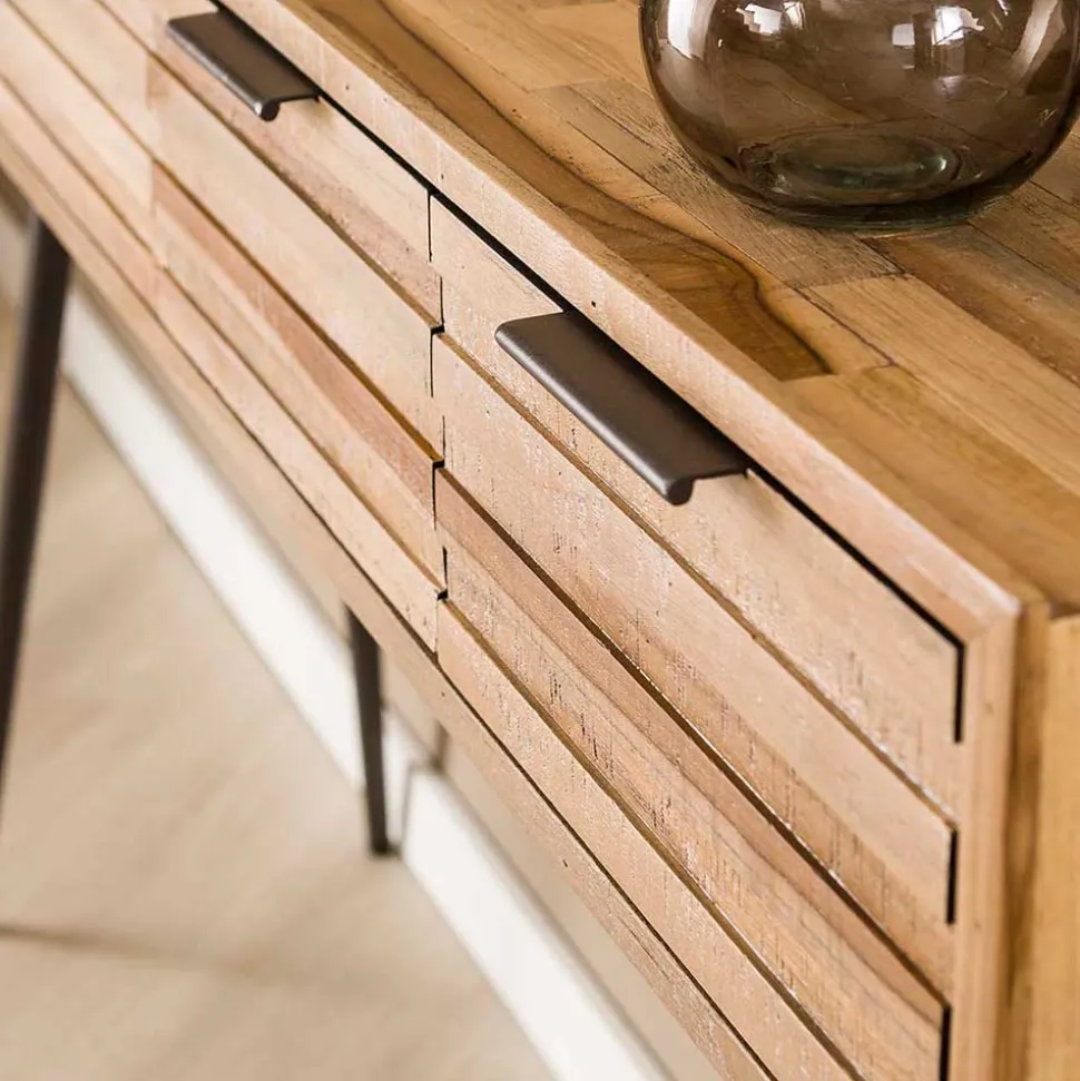 Der Konsolentisch Fire besteht aus massivem Teakholz und robustem Metall. Teakholz ist nicht nur langlebig und stabil, sondern punktet auch mit einer natürlichen Widerstandsfähigkeit gegen Feuchtigkeit und Temperaturschwankungen. Das verleiht diesem Möbelstück eine außergewöhnliche Haltbarkeit und macht es zu einem nachhaltigen Begleiter für viele Jahre. Die natürlich warme Holzoptik sorgt zudem für ein angenehmes Raumklima und eine behagliche Atmosphäre in jedem Raum.