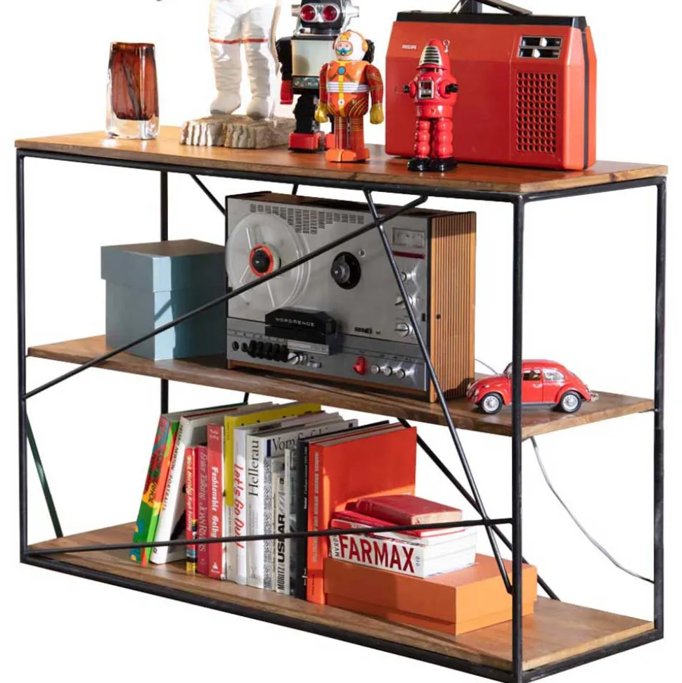 Mit einer Breite von 120 cm, einer Höhe von 82 cm und einer Tiefe von 40 cm bietet das Regal „Offia“ reichlich Platz für alles, was Sie zur Schau stellen oder verstauen möchten. Drei großzügige Böden laden dazu ein, Lieblingsbücher, Dekorationsobjekte oder sogar Pflanzen effektvoll zu präsentieren. Die stabilen Querstreben aus Metall sorgen nicht nur für die nötige Standfestigkeit, sondern sind auch ein optisches Highlight.