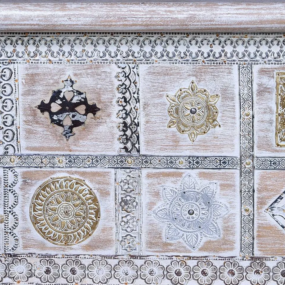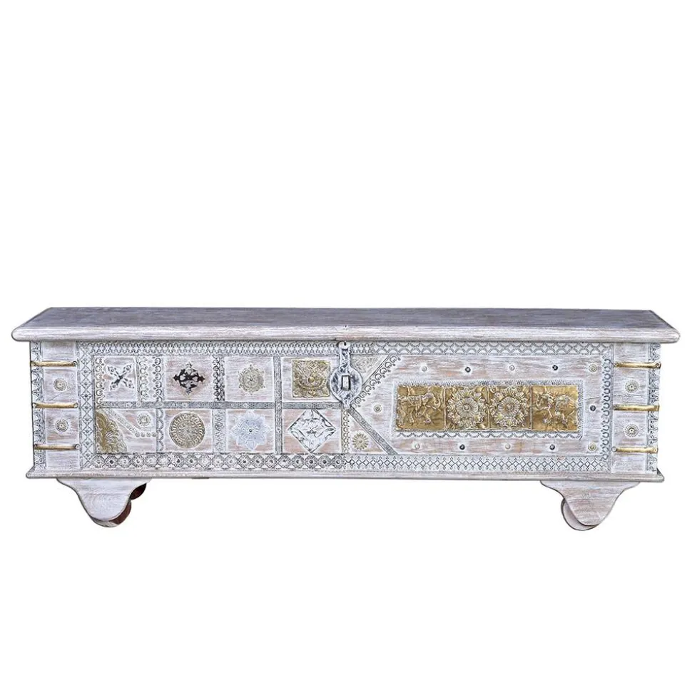 Die Truhe „Abraham“ vereint kunstvolle Handwerkskunst mit praktischer Funktionalität und bringt orientalisches Flair in Ihr Zuhause. Mit einer beeindruckenden Breite von 146 cm bietet sie nicht nur großzügigen Stauraum, sondern begeistert auch durch ihre außergewöhnliche Gestaltung. In Antikweiß gehalten und mit edlen Bronzedetails versehen, ist dieses Möbelstück ein wahres Schmuckstück für Wohn- oder Schlafzimmer. Aufwendig verzierte Oberflächen mit Ornamenten, floralen Mustern und anmutigen Elefantenmotiven machen jede Truhe zu einem Unikat – individuell gefertigt in sorgfältiger Handarbeit.