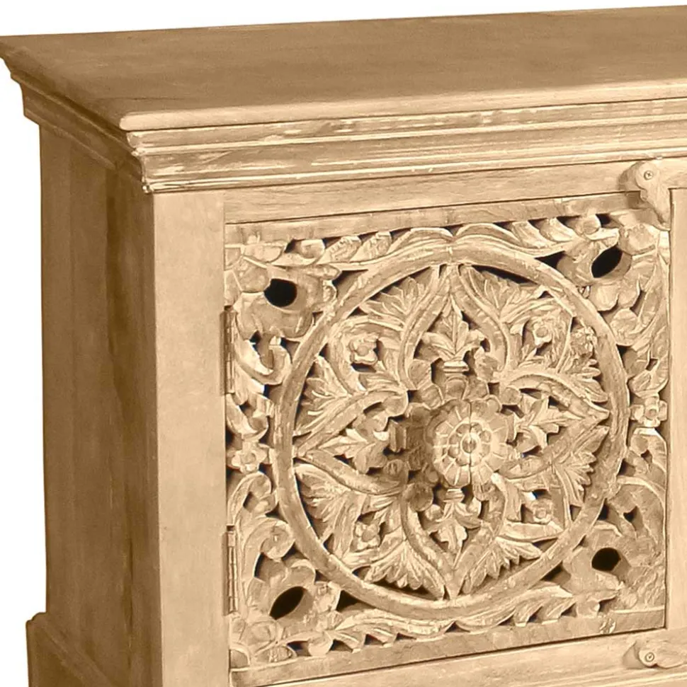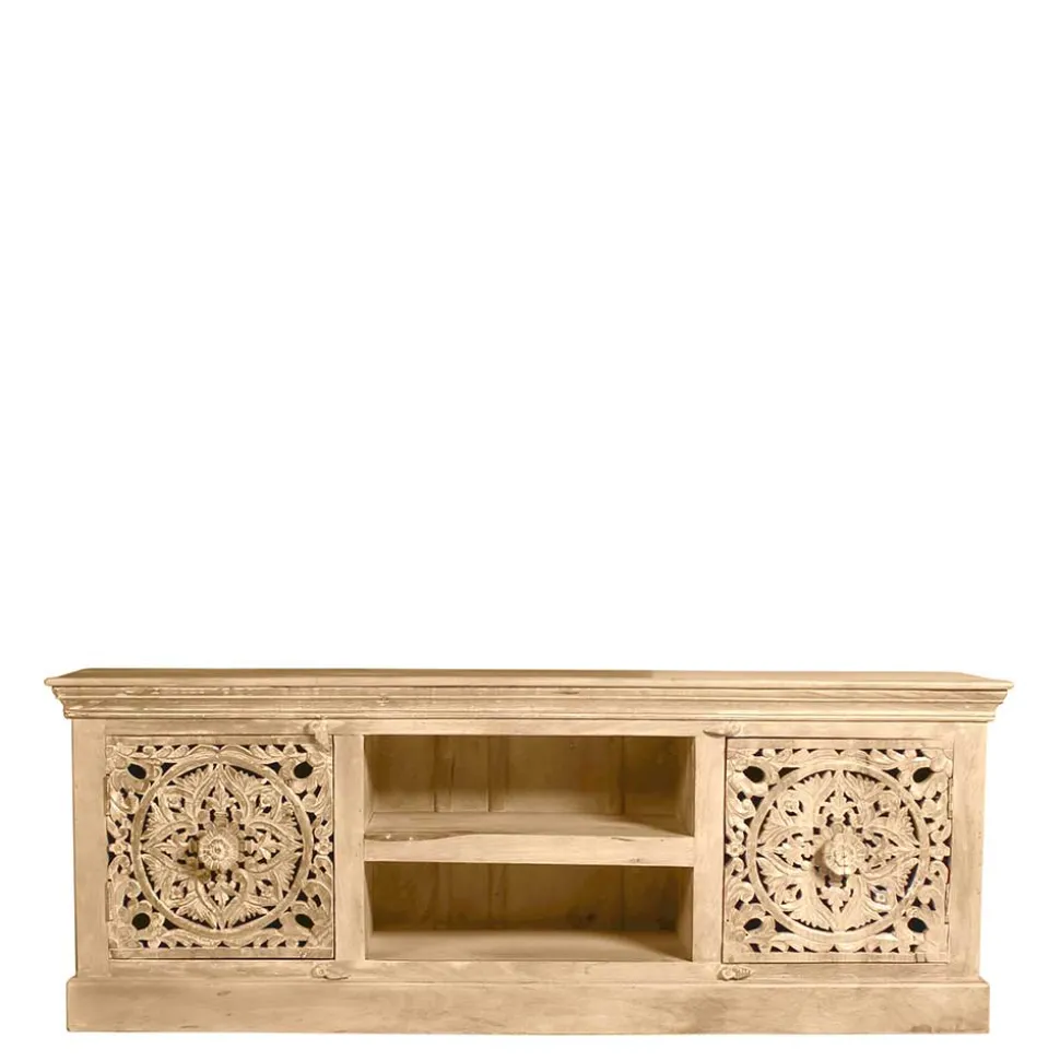 Entdecken Sie das einzigartige TV-Lowboard „Runiasa“ und bringen Sie den Charme des Vintage-Looks in Ihr Zuhause! Dieses außergewöhnliche Möbelstück wird in aufwendiger Handwerkskunst aus massivem Mangobaumholz gefertigt und verfügt über eine lackierte Oberfläche in Sandfarben, welche dem Lowboard eine besondere Patina verleiht.