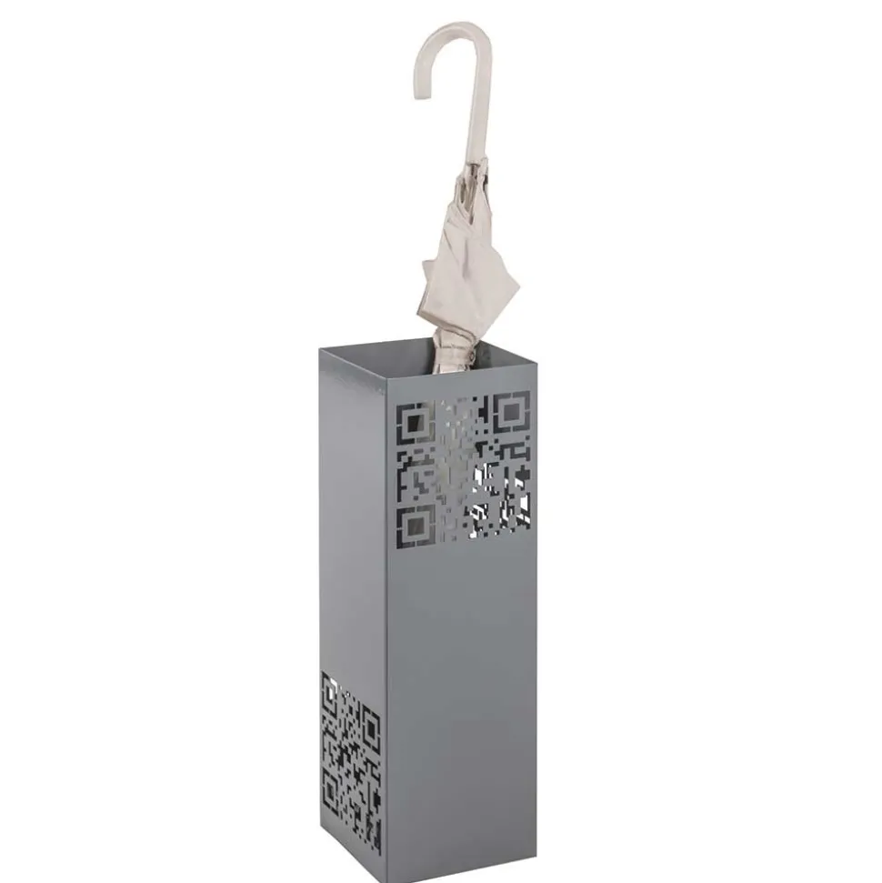 Mit „Ivonata“ zieht ein modernes Designobjekt in Ihren Flur ein, das Stil und Funktion geschickt verbindet. Der graue Schirmständer überzeugt mit seiner klaren Linienführung und einem besonderen gestalterischen Detail: dekorative QR-Code-Ausstanzungen auf allen vier Seiten – jeweils an anderer Position platziert – sorgen für eine spannende, grafische Dynamik und lassen den nüchternen Korpus lebendig wirken.
