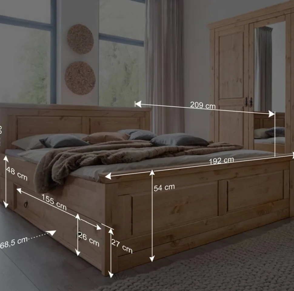Neben seinem ländlichen Charme überzeugt das Bett „Voeca“ auch durch seine Top Qualität aus bestem Naturmaterial und seine Stabilität. Die Einlegetiefe des Lattenrostes ist verstellbar von 9,5 bis 16,5 cm. Das Bett hat eine Breite von 192 cm, eine Höhe von 98 cm und eine Tiefe von 209 cm. Das Fußteil hat eine Höhe von 54 cm und das Kopfteil von 98 cm. Der Bodenabstand zum Seitenteil beträgt 27 cm.