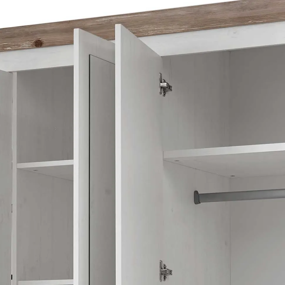 Die Möbelstücke sind aus robuster Spanplatte gefertigt und mit einer Holzoptik in Weiß foliert. Die Deckplatten, Kranzleisten und Sockel sind farblich in Pinie verwittert foliert abgesetzt, was dem Set eine einzigartige, zweifarbige Optik verleiht. Die Folierung schützt nicht nur die Oberflächen, sondern verleiht ihnen auch eine angenehm natürliche Haptik.