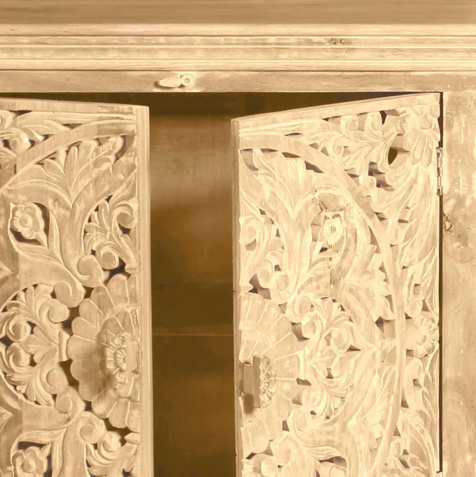 Die vier Türen des Sideboards sind aufwendig von Hand geschnitzt und mit floralen Motiven verziert, welche den einzigartigen Look des Sideboards unterstreichen. Hinter jeder Doppeltür befindet sich ein Holzboden, der den Stauraum praktisch aufteilt. Während die hübschen Holz-Knopfgriffe in Blütenform das Design des Sideboards perfekt abrunden, unterstreichen die formschön gefrästen Kanten die hochwertige Verarbeitungsqualität. Da jedes Möbelstück ein Unikat ist, können geringfügige Abweichungen in der Maserung und Farbe des Holzes auftreten.