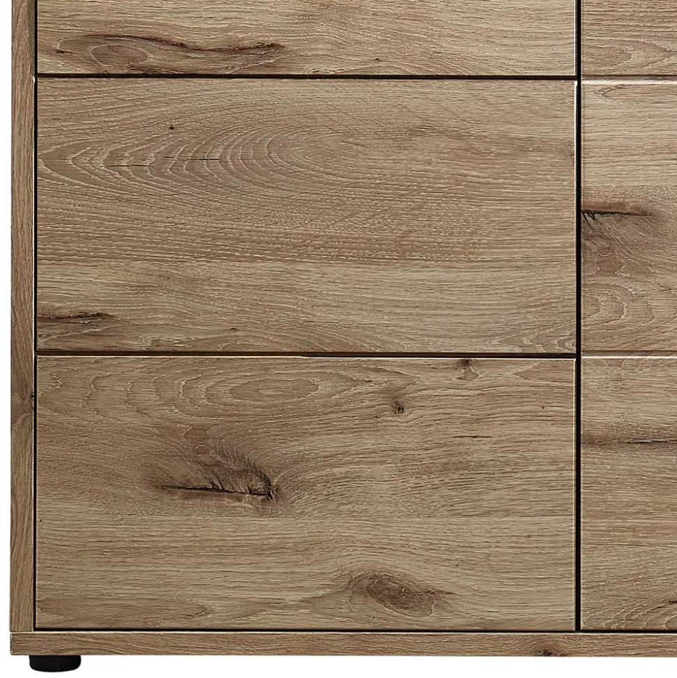 Ein herausragendes Merkmal des Sideboards „Zelio“ ist sein modernes Design, das sich perfekt in jede zeitgemäße Einrichtung einfügt. Die in Wildeiche Holzoptik folierte Oberfläche verleiht dem Möbelstück eine warme, natürliche Ausstrahlung. Die Folierung hat zahlreiche Vorteile: Sie schützt vor Kratzern, ist pflegeleicht und verlängert die Lebensdauer des Sideboards erheblich. Diese ästhetische und funktionale Kombination macht das Sideboard „Zelio“ zu einem echten Blickfang in Ihrem Zuhause.