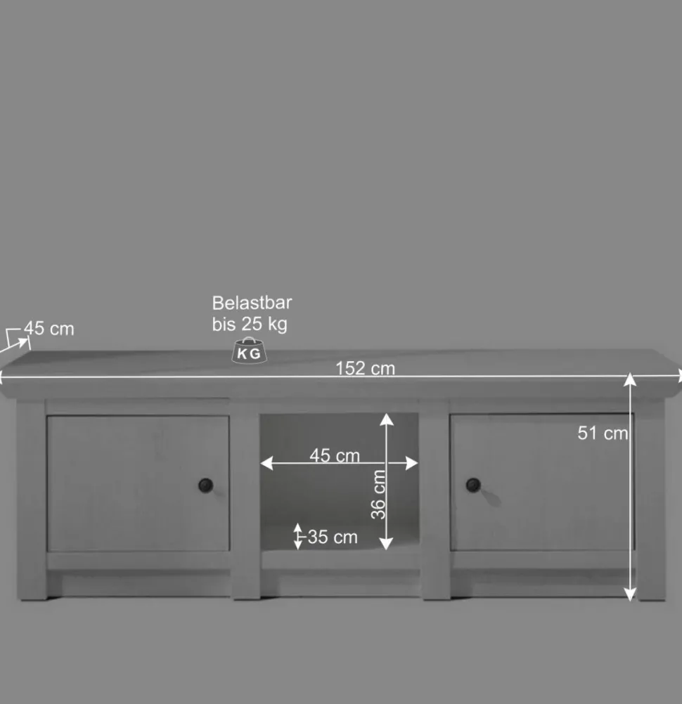 Das TV-Lowboard misst 152 cm in der Breite, 51 cm in der Höhe und 45 cm in der Tiefe. Dies bietet genügend Platz für Fernseher verschiedener Größen und gewährleistet eine optimale Sicht. Mit seiner großzügigen Belastbarkeit des Oberbodens von bis zu 25 kg können Sie Ihr Mediencenter sicher darauf abstellen.
