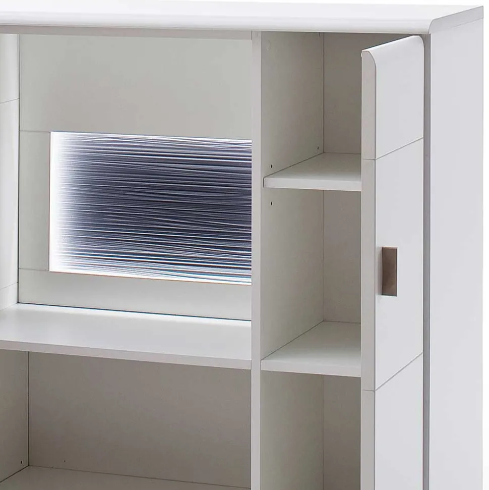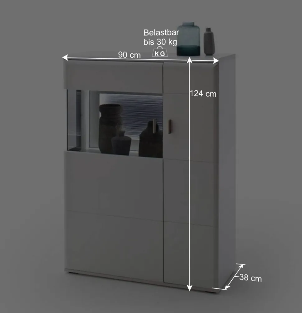 Mit seinen Maßen von 90 cm Breite, 124 cm Höhe und 38 cm Tiefe bietet das Highboard ausreichend Stauraum, um Ihre Dinge ordentlich zu organisieren. Es verfügt über zwei Türen, wobei die linke Tür einen stilvollen Glaseinsatz aus Parsolglas besitzt. Die sichtbare Rückwand des Glaseinsatzes ist in einem ansprechenden Anthrazit 3D geschroppt gestaltet, was dem Highboard eine besondere Note verleiht. Für zusätzlichen Komfort können Sie optional eine LED-Beleuchtung mit Dimmfunktion für das Fach mit Glaseinsatz hinzufügen.