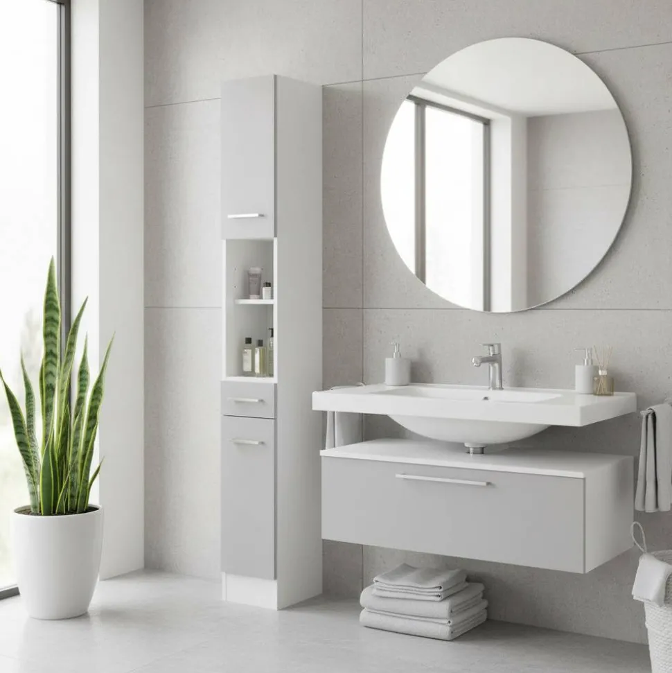 - Schnörkelloser Bad Hochschrank in Weiß und Hellgrau