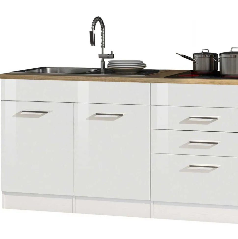 Besonders hervorzuheben sind die soliden Metallbeschläge an allen Türen und Klappen, die eine lange Lebensdauer und stabilen Halt garantieren. Für zusätzlichen Komfort sorgen die Schubladen mit Metallauszügen, die ein sanftes und leises Gleiten der Schubladen ermöglichen – so wird selbst das Öffnen und Schließen zu einem kleinen Luxusmoment im Alltag. Die formschönen, verchromten Metallgriffe verleihen der Küchenzeile eine zeitgemäße Note und unterstreichen das hochwertige Gesamtdesign.