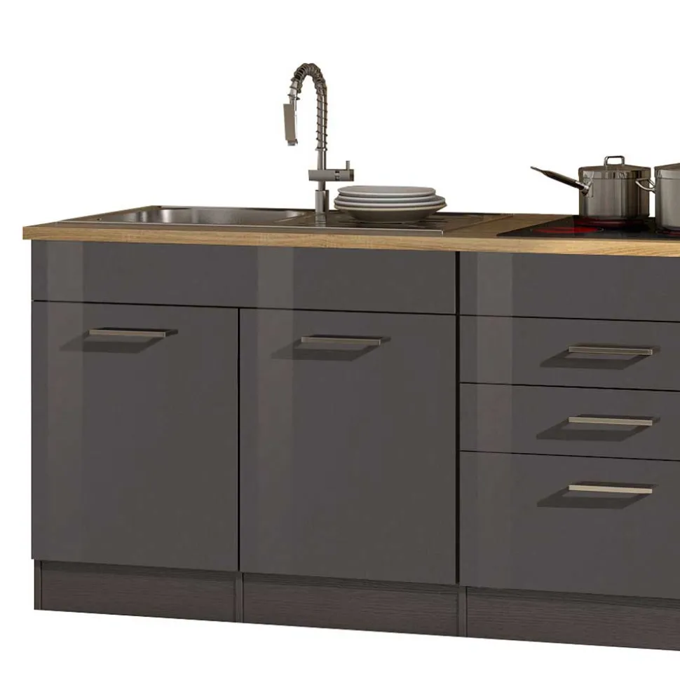 - Front grau Hochglanz foliert, Korpus grau, Arbeitsplatte in Holzoptik Sonoma Eiche melaminbeschichtet