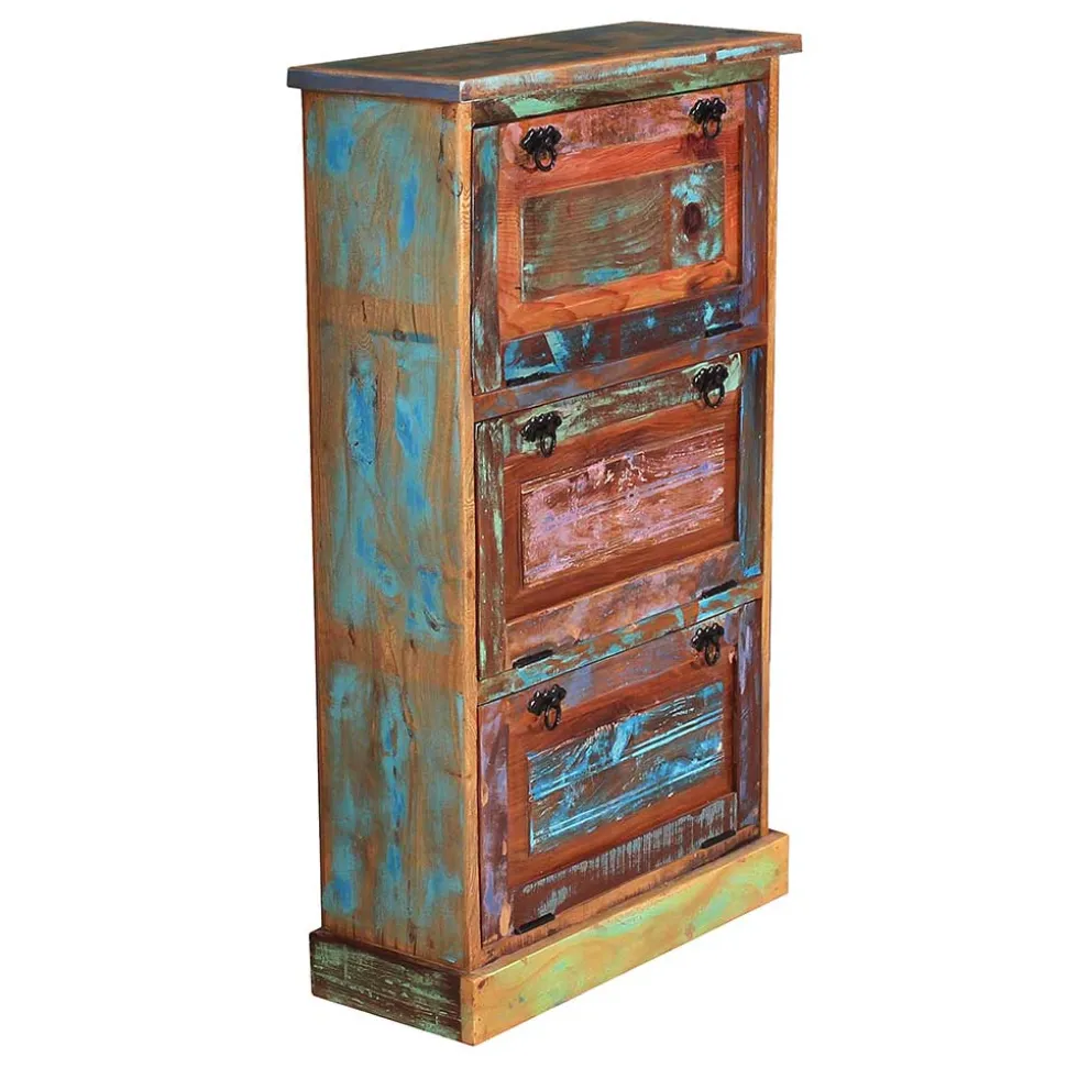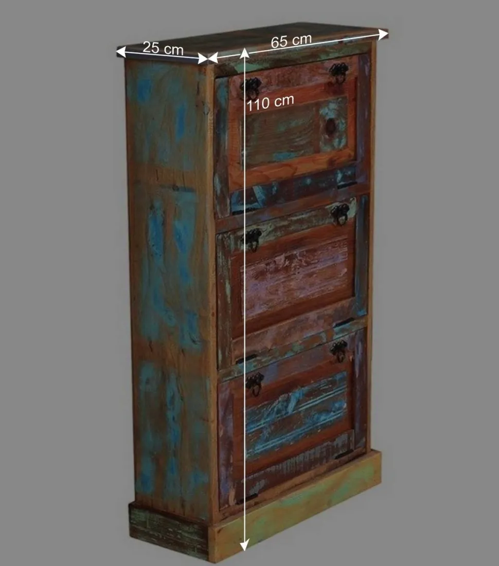 Unsere Schuhkommode „Jamaica“ wird aus altem Recyclingholz gefertigt, das von Fischerbooten stammt, die einst auf den Weltmeeren unterwegs waren. Die Verwendung von Recyclingholz hat gleich mehrere Vorteile: Zum einen leisten Sie einen wertvollen Beitrag zur Nachhaltigkeit, da keine neuen Bäume für die Produktion gefällt werden müssen. Zum anderen garantiert Ihnen Recyclingholz ein einzigartiges Möbelstück mit Geschichte und Seele.