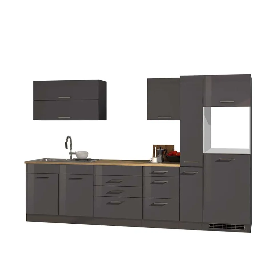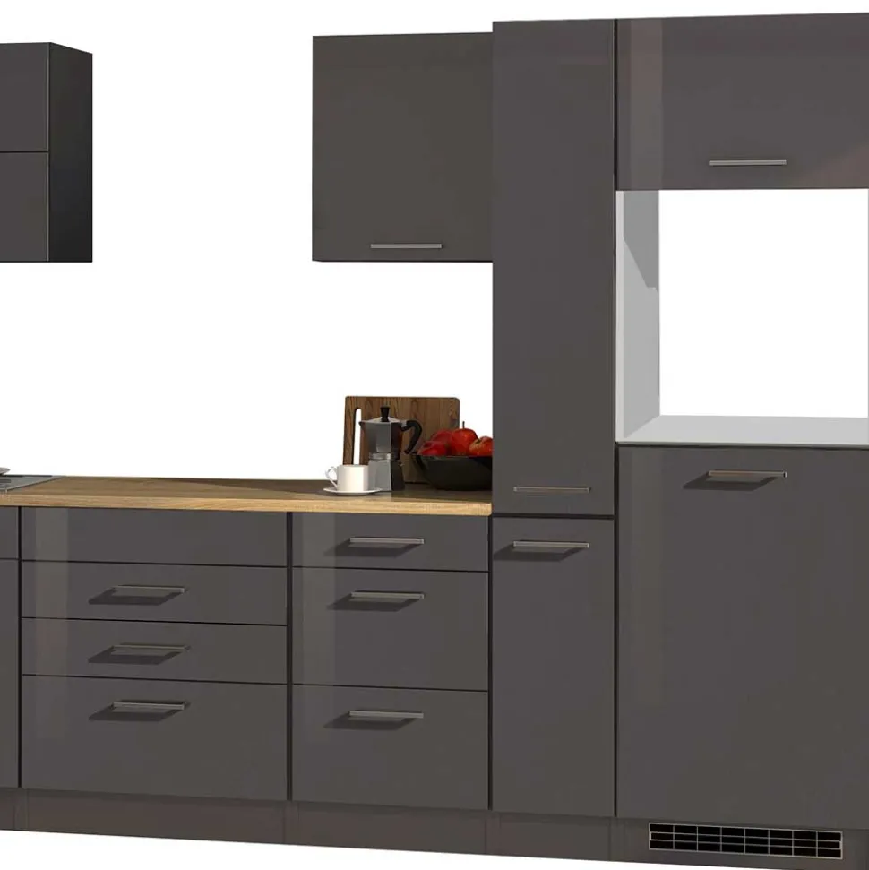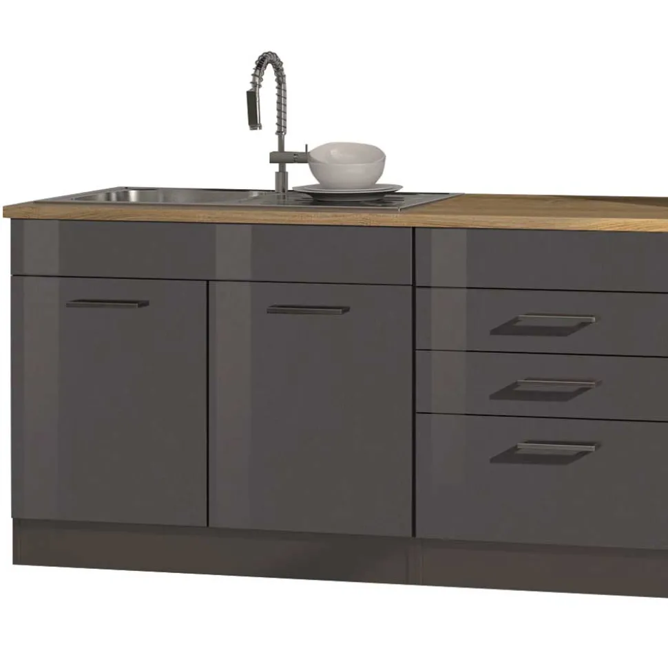 Hochglanzfolierung und Melaminbeschichtung machen diese Küchenzeile besonders widerstandsfähig. Die Folierung verleiht den grauen Fronten nicht nur ihren glänzenden Look, sondern schützt auch vor Feuchtigkeit, Schmutz und Kratzern. Die melaminbeschichtete Arbeitsplatte bietet eine robuste, hitze- und abriebfeste Oberfläche, auf der auch intensives Arbeiten mühelos möglich ist. Beide Verfahren sind bewährte Standards im hochwertigen Möbelbau und sorgen dafür, dass Ihre Küche dauerhaft gepflegt und ansprechend bleibt.
