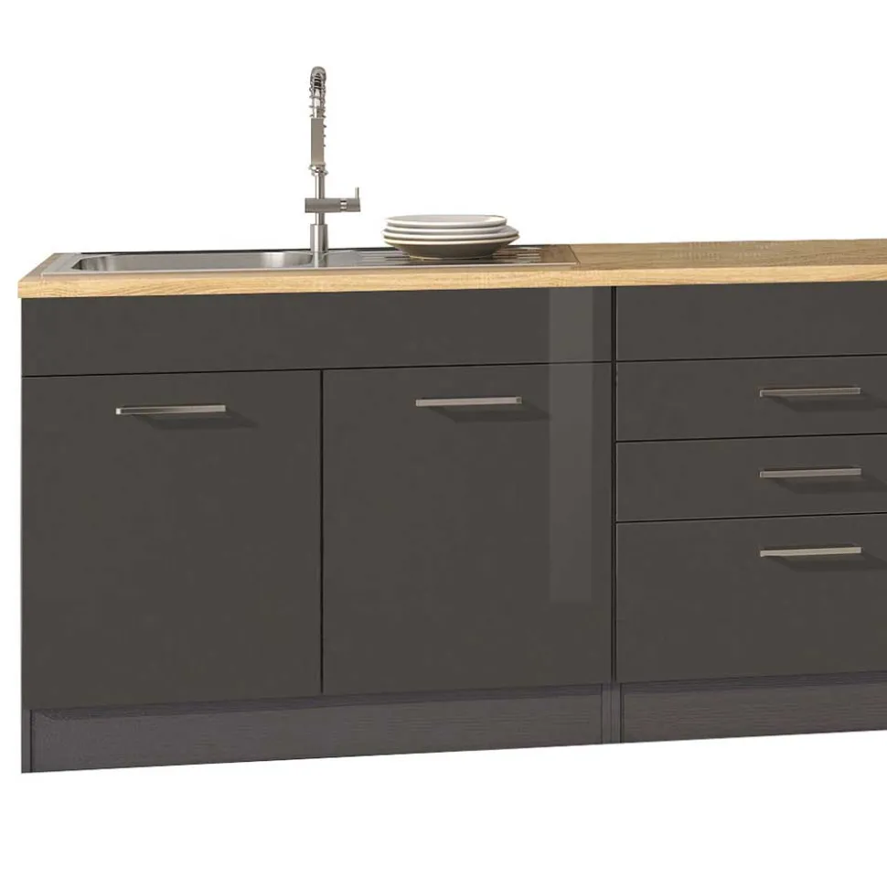 Ein weiteres Highlight dieser Küchenzeile ist der Spülenschrank mit integriertem Spülbecken aus pflegeleichtem Edelstahl. Das Becken ist nicht nur resistent gegen Flecken und Kratzer, sondern auch besonders hygienisch. Eine Armatur ist nicht im Lieferumfang enthalten, sodass Sie diese ganz nach Ihren persönlichen Vorlieben auswählen können. Die Arbeitsplatte kommt bewusst ohne Ausschnitt, was Ihnen maximale Flexibilität bei der Positionierung des Spülbeckens und der Armatur bietet. So lässt sich die Küche perfekt an Ihre individuellen Anforderungen anpassen.