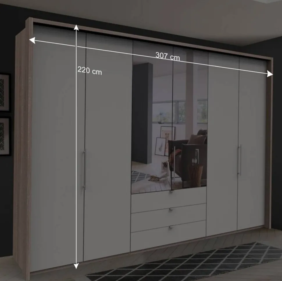 „Vaclyn“ überzeugt nicht nur durch seine außergewöhnliche Optik, sondern auch durch seine klare Formensprache. Mit seiner Breite von 300 cm, Tiefe von 58 cm und Höhe von 216 cm (oder 307 cm breit und 220 cm hoch, inklusive dem optional erhältlichen Passepartout-Rahmen) bietet der Schrank reichlich Stauraum für Ihre Kleidung und Accessoires. Die drei Panorama-Falttüren im Sechs-Türen-Look sind besonders platzsparend, da sie einfach nach vorne gezogen werden.