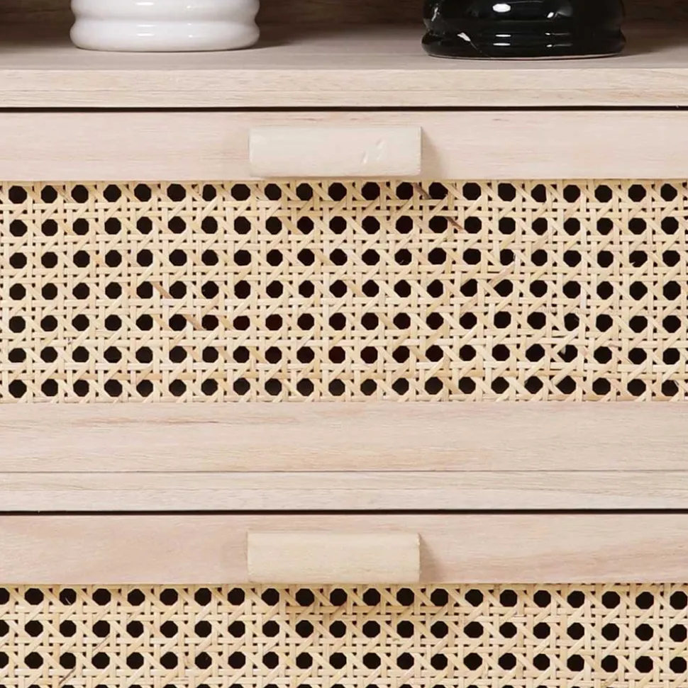 - Schubladenfronten mit feinem Rattangeflecht gestaltet