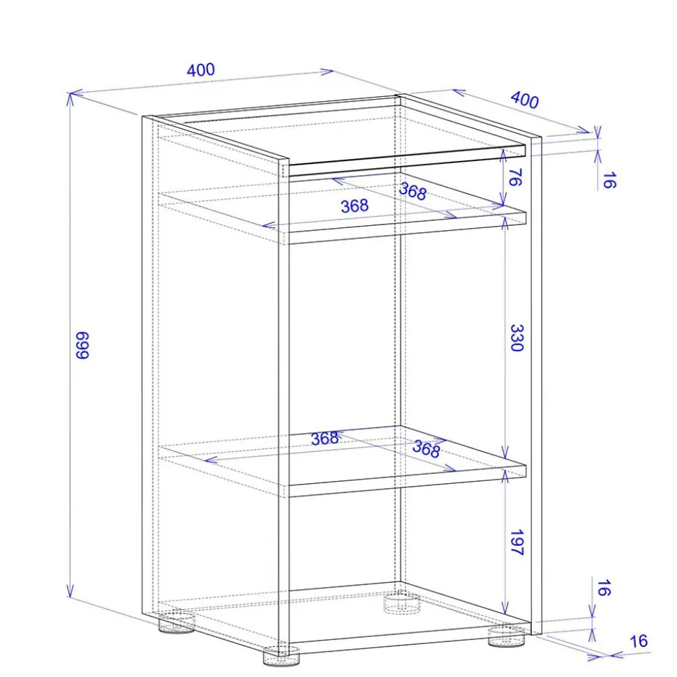 Das Regal steht auf flachen Kunststoffgleitern, die eine einfache und sichere Bewegung des Möbelstücks ermöglichen, ohne den Boden zu beschädigen. Diese Gleiter bieten eine stabile Basis und erleichtern das Verschieben des Regals bei Bedarf.