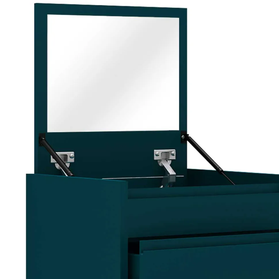 - Die Deckplatte lässt sich hochklappen, darunter befindet sich ein Spiegel und eine Ablage für Kosmetika, gedämpfte Metallbeschläge