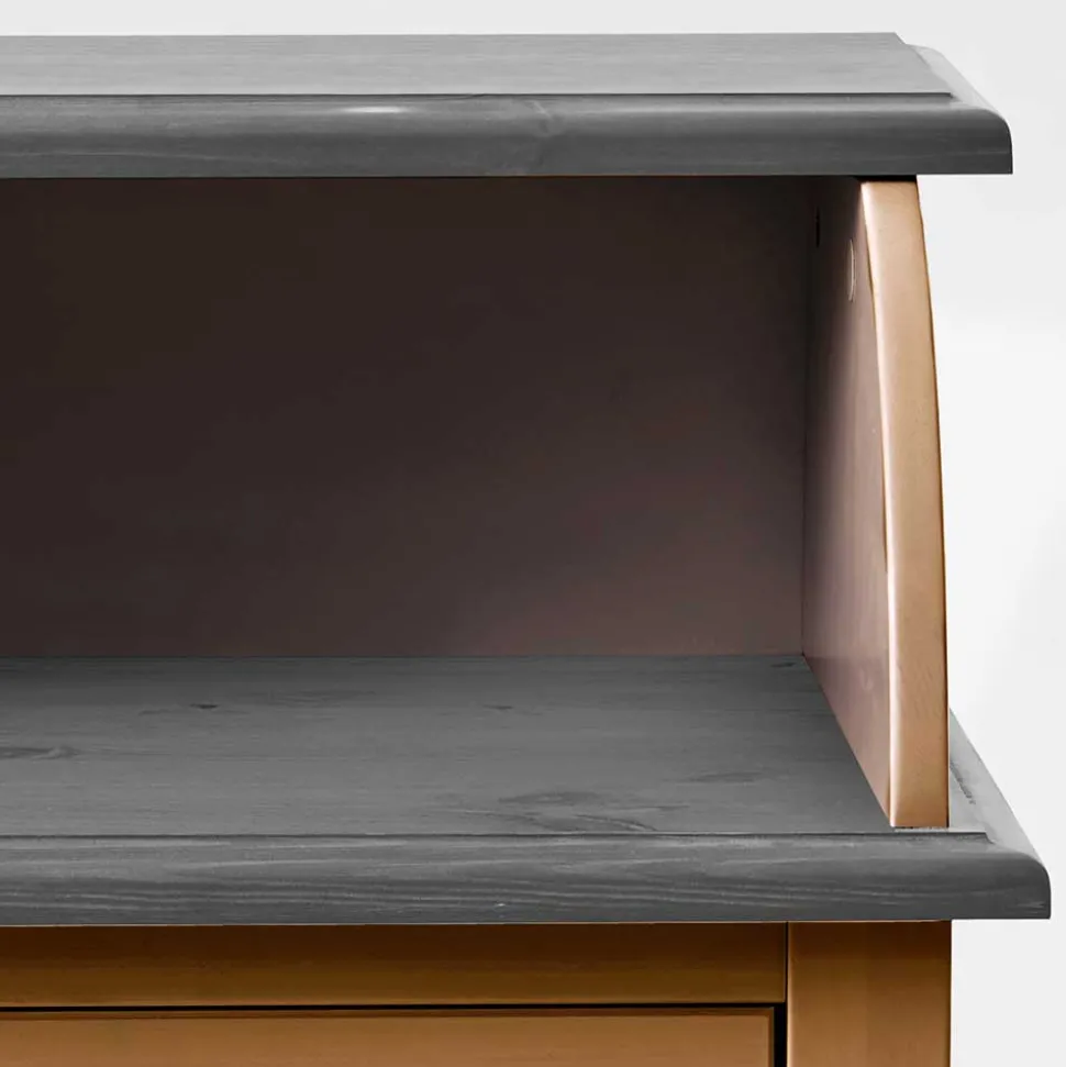 Die Oberfläche des Telefontisches ist in Laugenfarben gebeizt und geölt, was dem Holz einen warmen und einladenden Charakter verleiht. Die Tisch- und Oberplatte in Grau lackiert, hebt die natürliche Holzmaserung hervor und bietet zusätzlichen Schutz. Dieser zweifarbige Look verleiht dem Möbelstück eine moderne und doch zeitlose Eleganz.