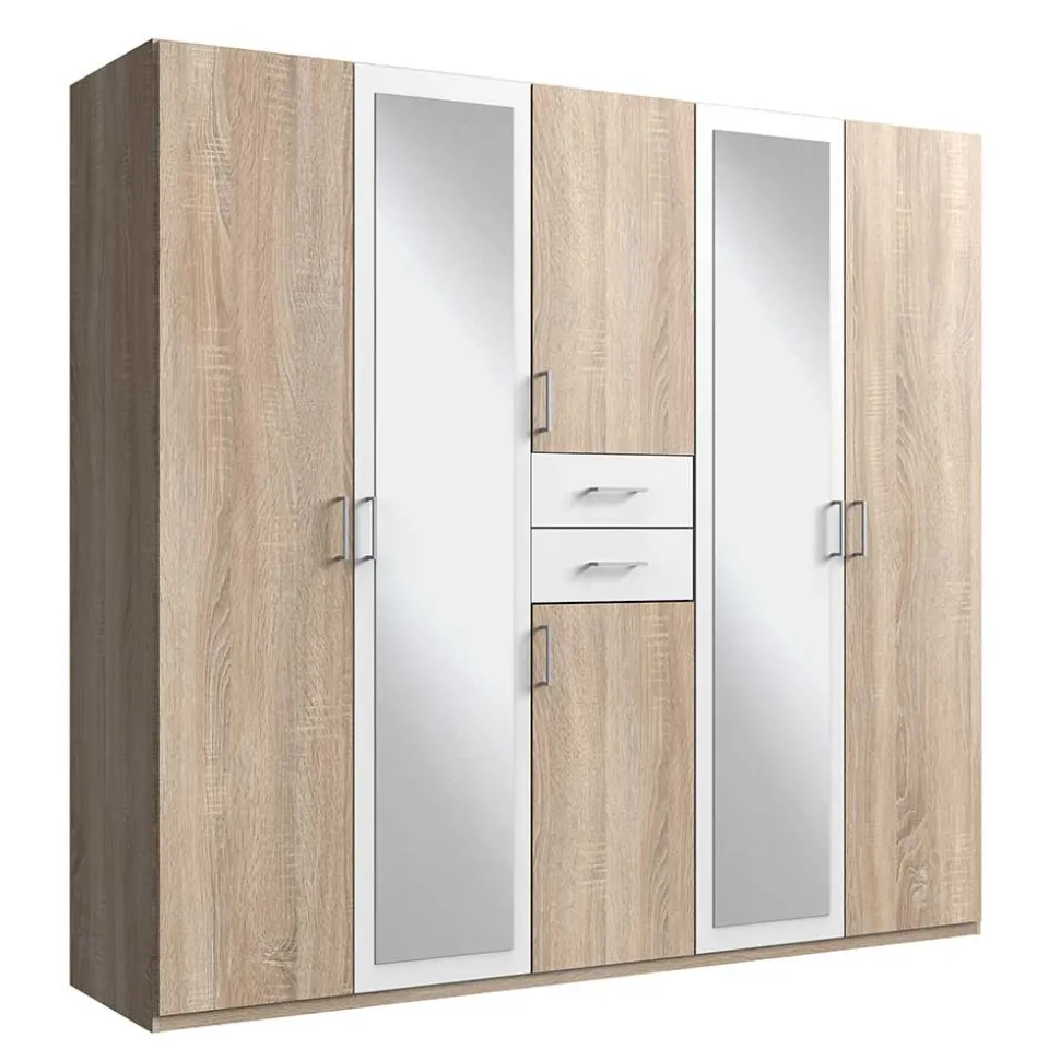 Mit einer Breite von 225 cm, einer Höhe von 208 cm und einer Tiefe von 58 cm bietet der Kleiderschrank „Coint“ jede Menge Stauraum für Ihre Garderobe. Dank der übersichtlichen Einteilung behalten Sie stets den Überblick über Ihre Kleidung. Der Schrank verfügt über sechs Drehtüren in zwei unterschiedlichen Größen, die mit stabilen Metallbeschlägen ausgestattet sind. Zwei der Türfronten sind mit praktischen, weiß gerahmten Ganzkörperspiegeln versehen, die Ihnen nicht nur die tägliche Outfit-Wahl erleichtern, sondern auch den Raum optisch vergrößern.