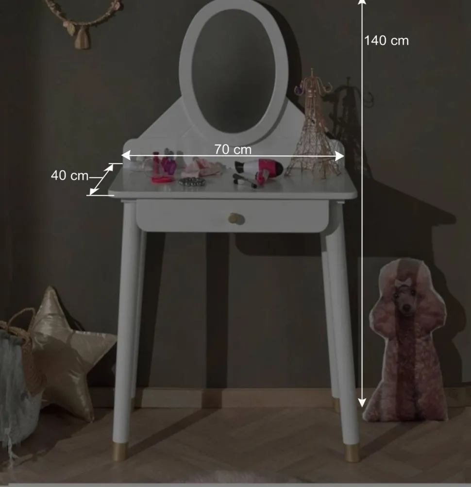 Mit einer Tischplattenhöhe von 75 cm bietet die Schminkkonsole eine angenehme Arbeitshöhe und sorgt mit ihren abgerundeten Kanten für ein harmonisches Erscheinungsbild. Die Platte selbst misst 70×35 cm und bietet ausreichend Platz für Ihre wichtigsten Utensilien. Der Schminktisch ist mit einer geräumigen Schublade ausgestattet, die über einen praktischen Metallauszug verfügt und Innenmaße von 27×6,8×33,4 cm aufweist – ideal, um Schminkutensilien, Accessoires oder kleine Gegenstände ordentlich zu verstauen. Der runde Knopfgriff in Gold sorgt für ein komfortables Öffnen und Schließen der Schublade und rundet das stilvolle Gesamtbild ab.