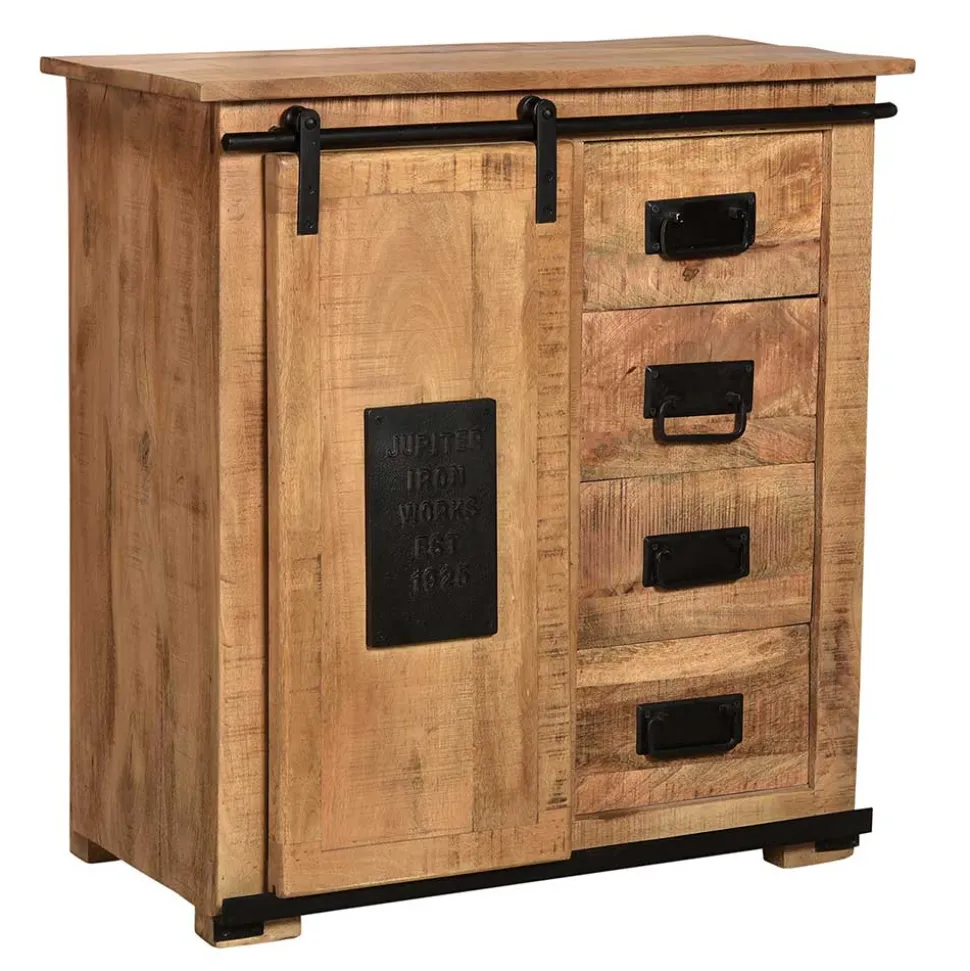 Die Kommode bietet mit einer rustikalen Schiebetür, die auf Metall-Laufrollen gleitet, ein variables Stauraumerlebnis. Hinter der Tür befindet sich ein Einlegeboden, wodurch Sie je nach Türposition offene oder geschlossene Fächer kreieren können. Die vier Schubladen mit rustikalem Holzauszug und nostalgisch anmutenden Metall-Klappgriffen ergänzen das Stauraumangebot perfekt.