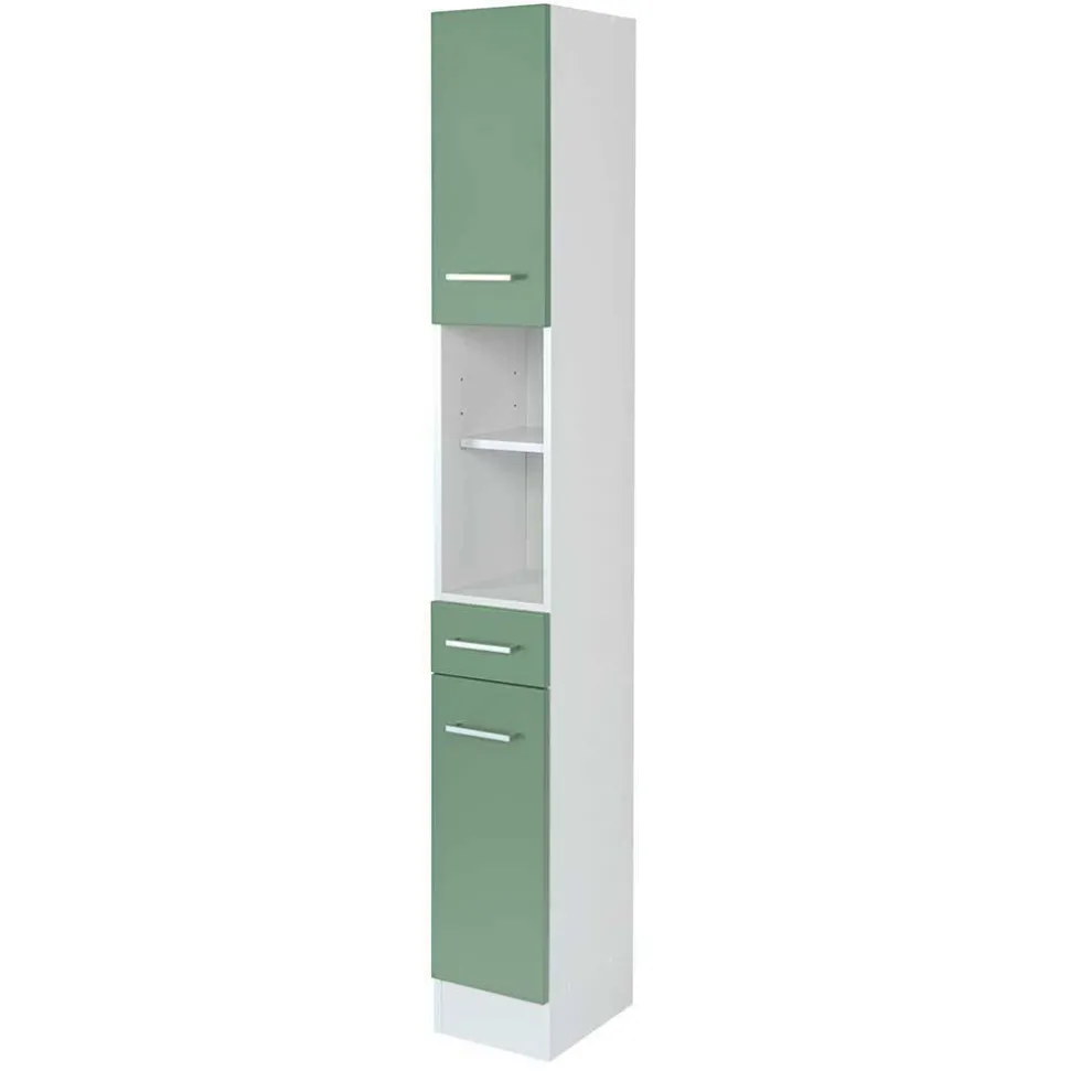 Sanfte Farbkontraste und klare Linien geben diesem Set eine zeitlose Modernität, die nie aus der Mode kommt. Das offene Fach im Hochschrank und unter dem Spiegelschrank setzt dekorative Highlights, während die LED-Beleuchtung für ein stimmungsvolles Ambiente sorgt. Weiß reflektiert das Licht und lässt den Raum größer wirken, während das Grün Frische und Individualität ausstrahlt – perfekt für alle, die ihrem Badezimmer Charakter verleihen möchten.