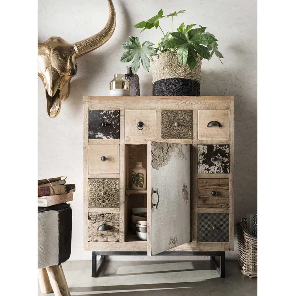Die Holzoberfläche wird mit einem White Wash Effekt behandelt, der dem Möbelstück eine sanfte, helle Patina verleiht. Ein besonderes Highlight sind die Schubladen- und Türfronten, teils verziert mit echtem Ziegenfell und messingfarbigem Metall, die eine exotische und luxuriöse Note hinzufügen. Die Ölung des Holzes trägt zur Pflege und zum Schutz des Materials bei, während sie gleichzeitig die natürliche Schönheit des Holzes unterstreicht.