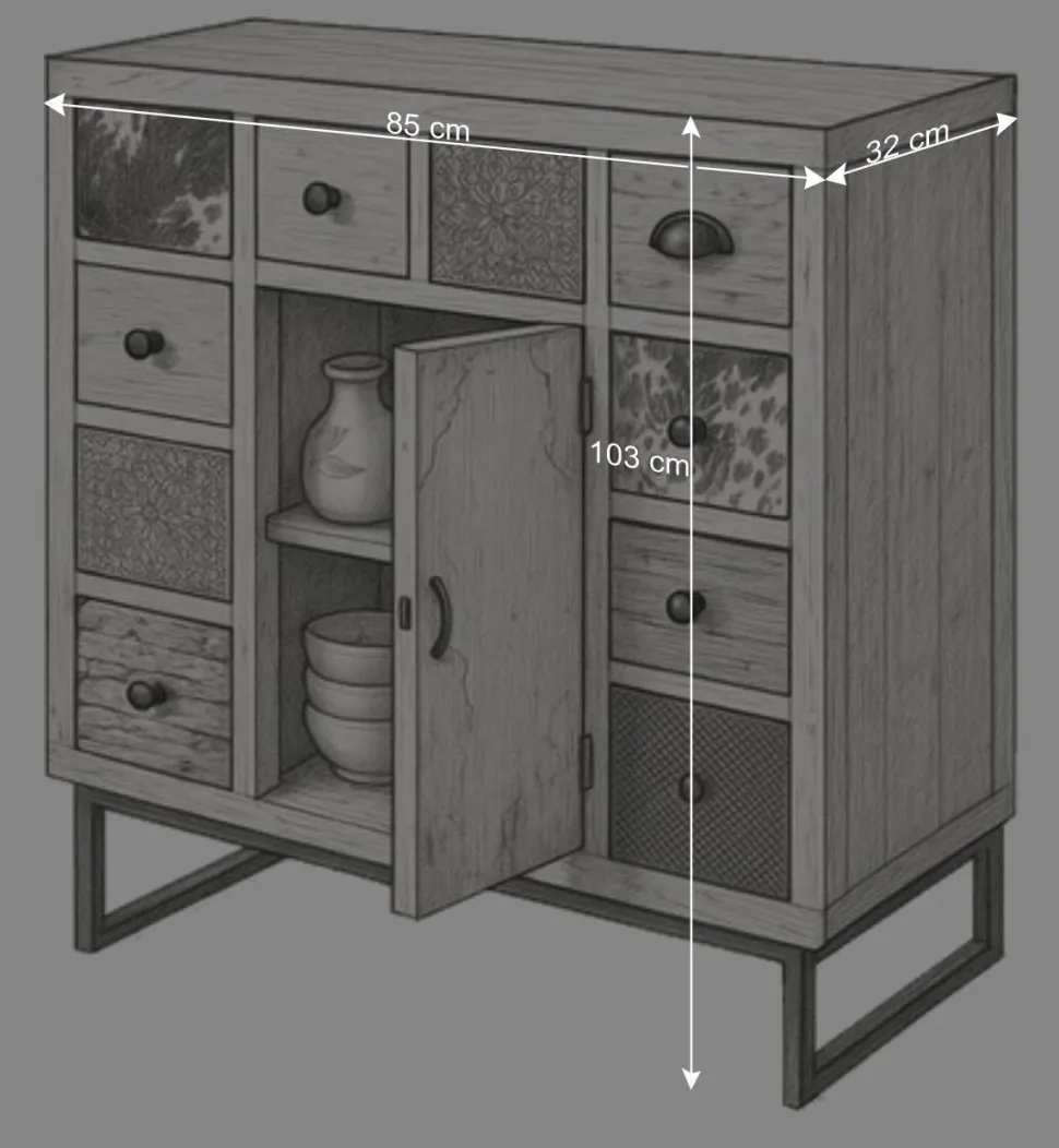 Mit einer Breite von 85 cm, einer Höhe von 103 cm und einer Tiefe von 32 cm bietet die Kommode „Antra“ reichlich Stauraum. Hinter einer Tür verbirgt sich ein praktischer Einlegeboden. Zehn Schubkästen in unterschiedlichen Größen, ausgestattet mit Holzauszügen, bieten Platz für diverse Kleinigkeiten. Die verschiedenen Knopf-, Muschel-, Ring- und Bügelgriffe aus Metall unterstreichen den individuellen Charakter des Möbelstücks.