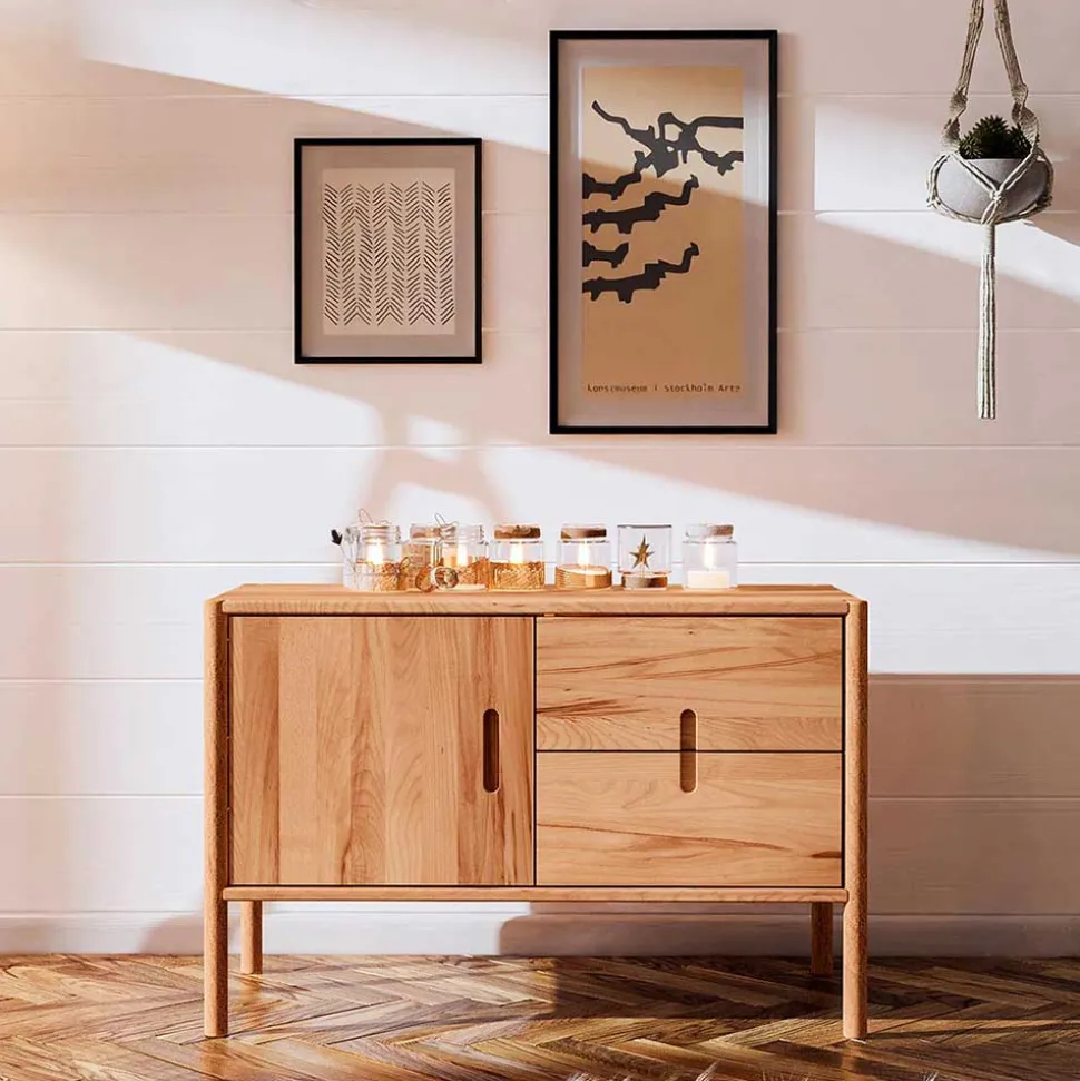 Die Oberfläche der Kommode „Indrya“ wurde sorgfältig natürlich geölt. Dieses Verfahren hebt nicht nur die natürliche Schönheit der Wildbuche hervor, sondern schützt das Holz auch vor äußeren Einflüssen. Das Öl dringt tief in das Holz ein, nährt es und lässt es atmen, während es gleichzeitig eine schützende Schicht bildet. So bleibt die Kommode lange Zeit so schön wie am ersten Tag.