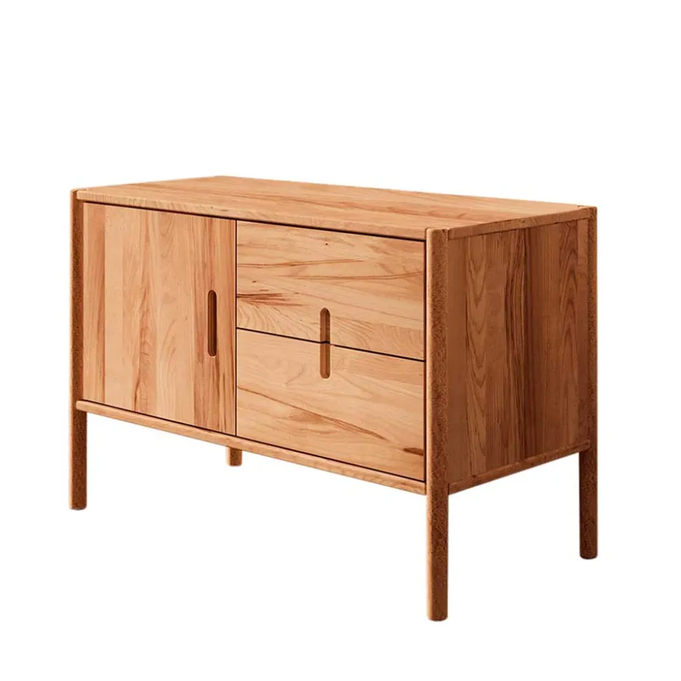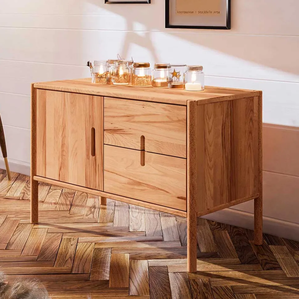 Für die Herstellung von „Indrya“ kommt ausschließlich massives Wildbuchenholz zum Einsatz, ein Material, das durch seine Langlebigkeit und Robustheit besticht. Wildbuche zeichnet sich durch ihre einzigartige Maserung und die warmen, natürlichen Farbtöne aus. Die natürliche Struktur des Holzes bleibt erhalten und bringt ein Stück Natur direkt in Ihr Zuhause. Die durchgehenden Lamellen sorgen für eine homogene Optik und unterstreichen den hochwertigen Charakter der Kommode.