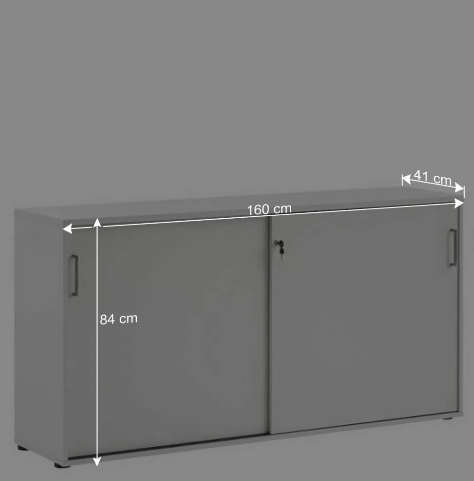 Handliche Metallbügelgriffe bieten angenehmen Komfort beim Öffnen und Schließen der Türen, während stoßfeste ABS-Kanten für Langlebigkeit und Schutz vor Beschädigungen sorgen. Der Aktenschrank ruht auf flachen Kunststofffüßen, die für Stabilität sorgen und gleichzeitig empfindliche Bodenbeläge schonen. Mit einer Breite von 160 cm, einer Höhe von 84 cm und einer Tiefe von 41 cm bietet dieses Möbelstück erstaunlich viel Stauraum auf kompakter Fläche.