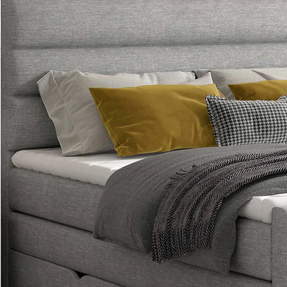 Unter dem kompletten Boxspringaufbau verbergen sich zwei großzügige Bettkästen, jeweils unterteilt in zwei Segmente. Das Besondere: Dank der praktischen Lift-Funktion lässt sich das gesamte Liegesystem – also Box, Matratze und Topper – bequem von den Längsseiten Richtung Bettmitte hochklappen. So erhalten Sie schnellen Zugang zu zusätzlichem Stauraum, ohne auf Komfort verzichten zu müssen.