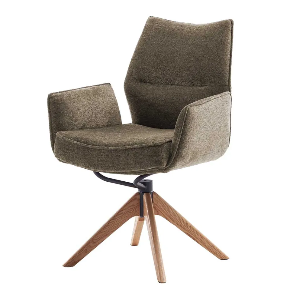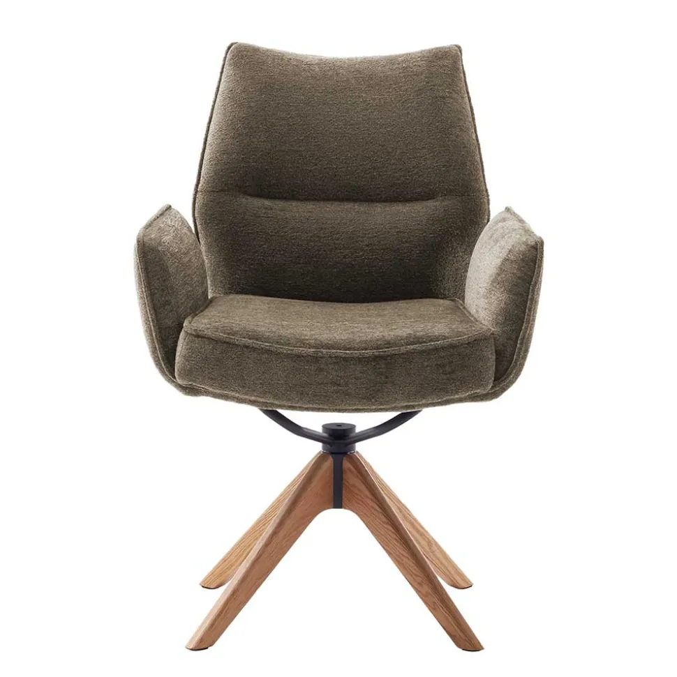 Der Armlehnenstuhl „Joycelina“ verbindet wohnliches Design mit exzellentem Sitzkomfort. Der strukturierte Chenillegewebe-Bezug in Braun sorgt für eine einladende Optik, während das lackierte Eiche-Massivholzgestell mit Schwingfunktion eine natürliche Wärme ins Esszimmer bringt.