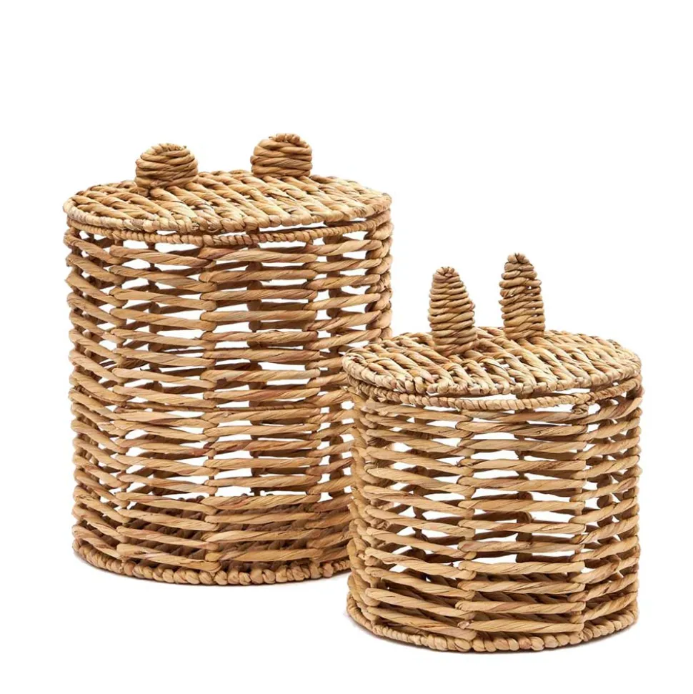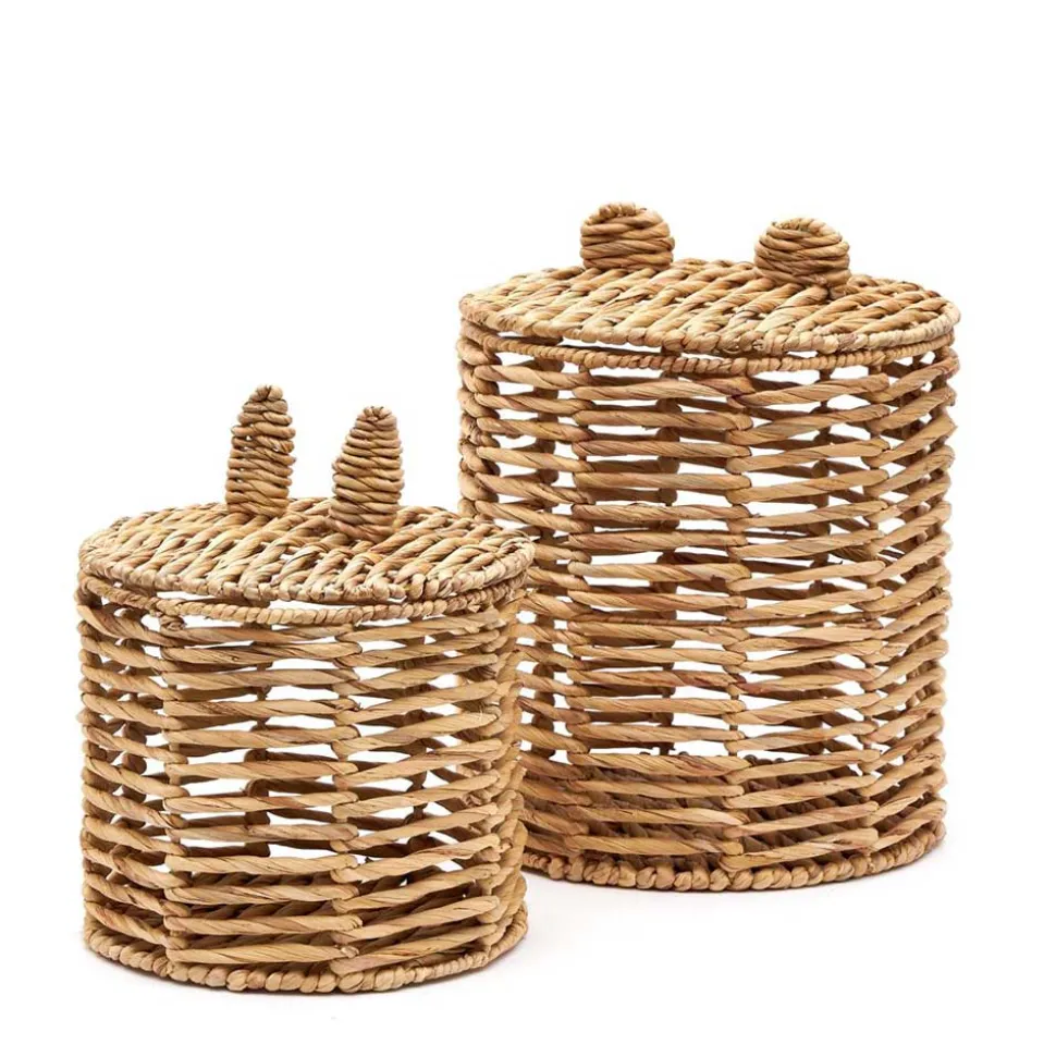 Die Deckel sind mit niedlichen Hasen- und Bärenohren versehen, die den Körben eine fröhliche und einzigartige Note verleihen. Ideal fürs Kinderzimmer oder als dekorative Aufbewahrungslösung in anderen Wohnbereichen.
