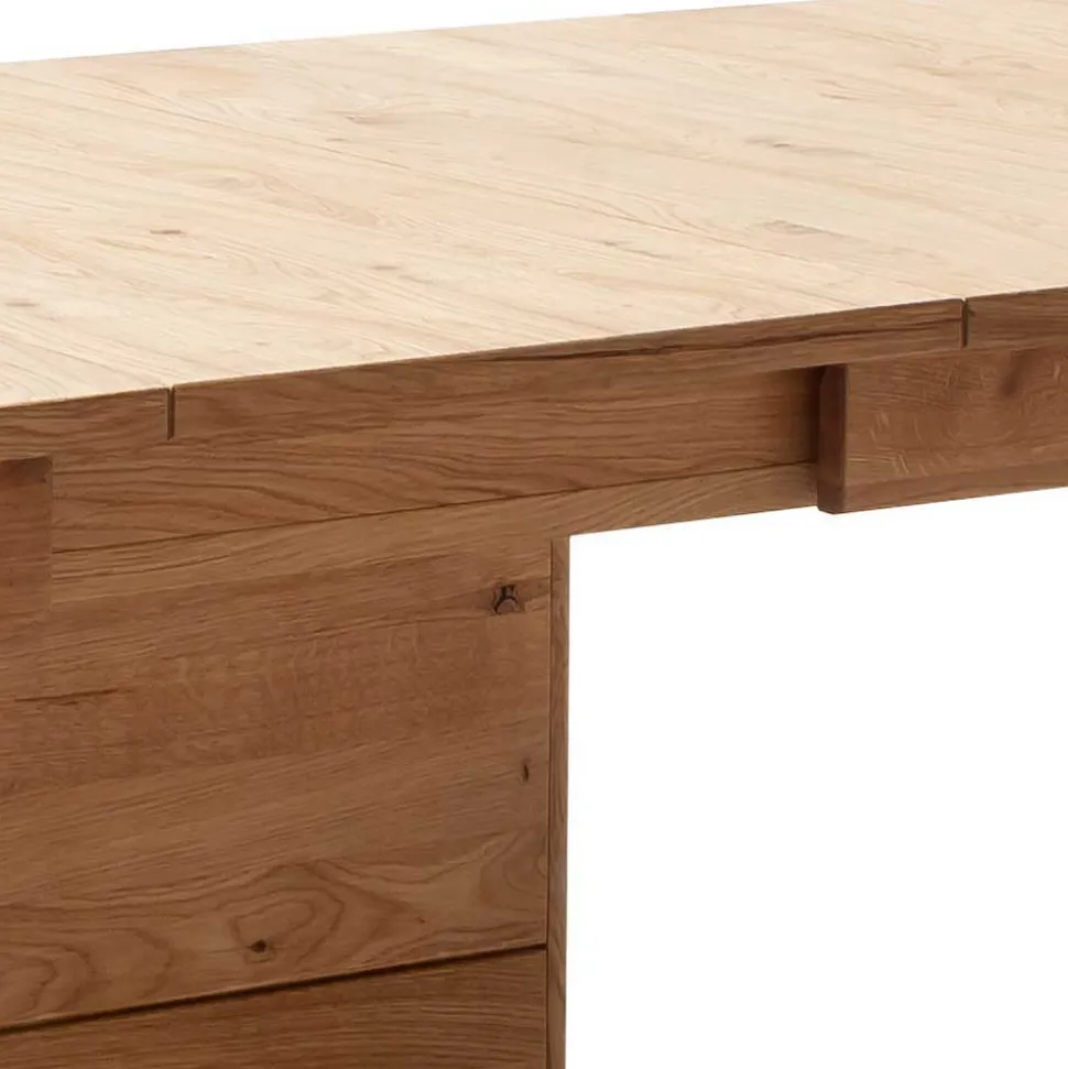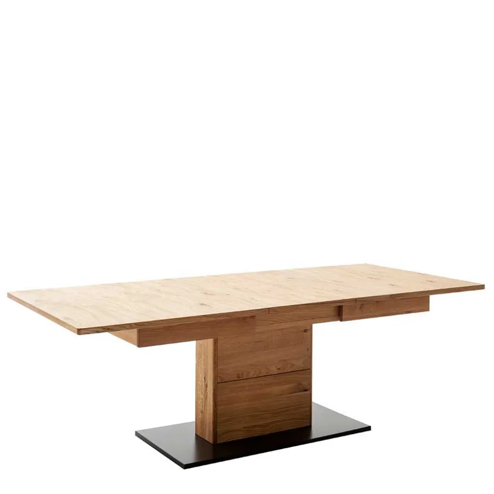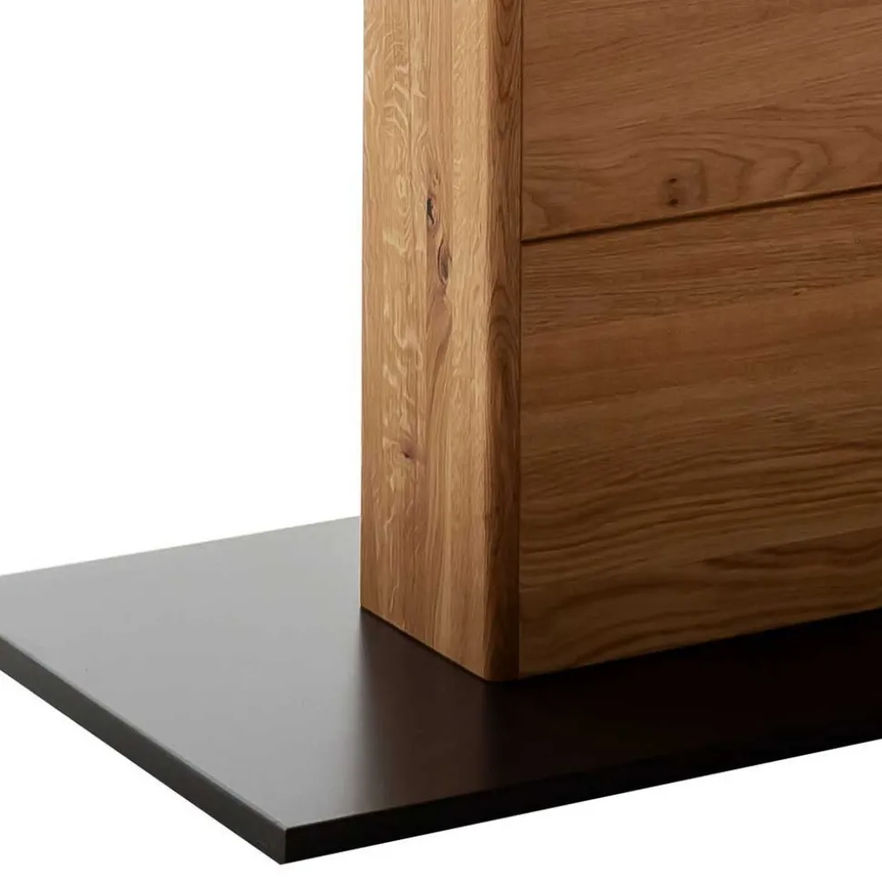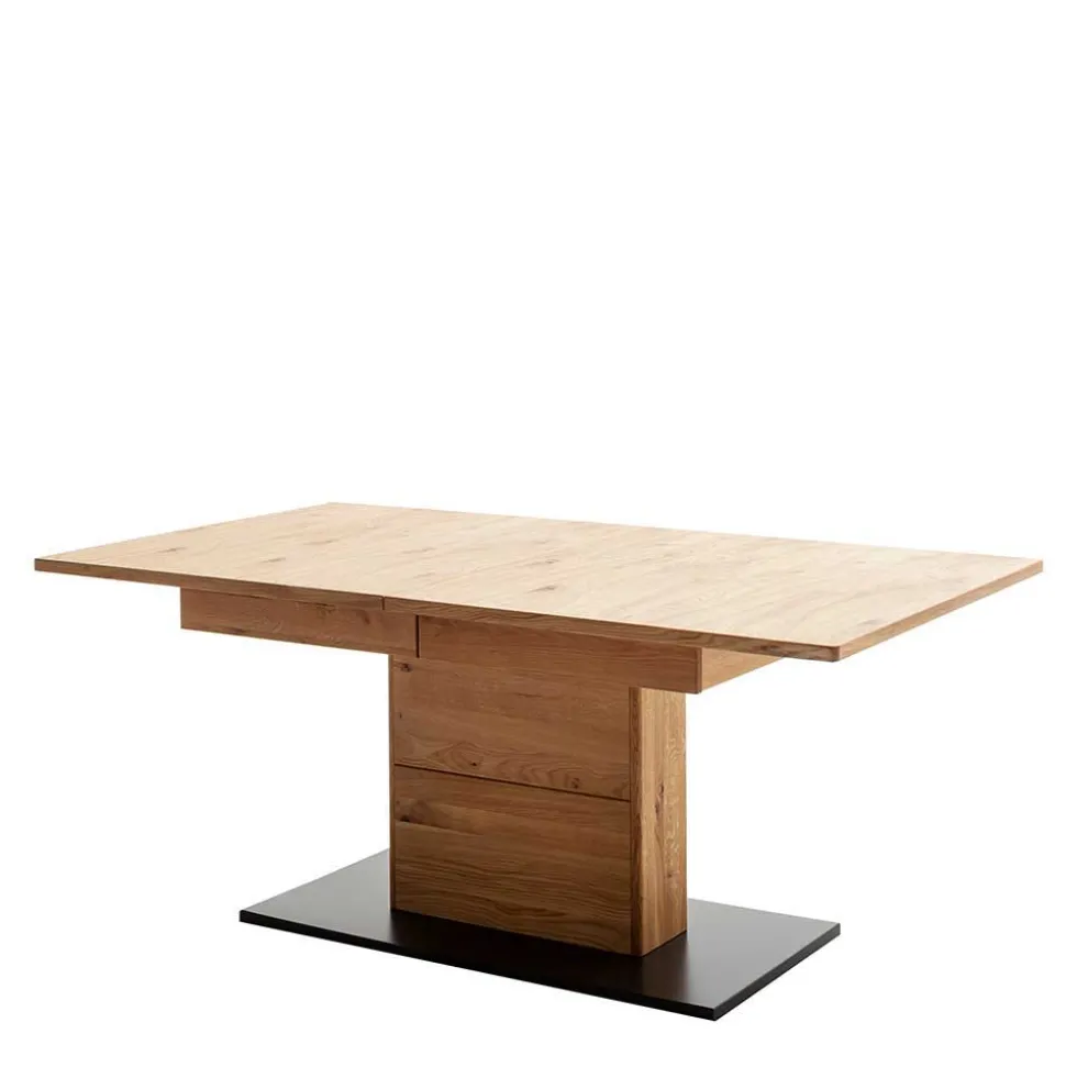 Die Tischplatte aus massiver Wildeiche, behandelt mit einem Ölfinish für Langlebigkeit und Ästhetik, steht in beeindruckendem Kontrast zum Säulengestell aus Holzwerkstoff. Unterstrichen wird diese Kombination durch eine Bodenplatte in elegantem Anthrazit. Doch nicht nur das Design überzeugt – der Tisch lässt sich spielend leicht um 50 cm erweitern, von ursprünglichen 180 cm auf großzügige 230 cm, und bietet somit Platz für zusätzliche Gäste oder kulinarische Köstlichkeiten.