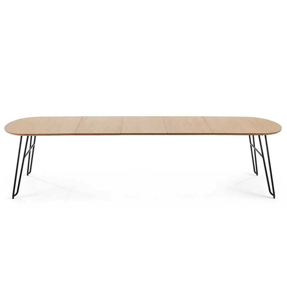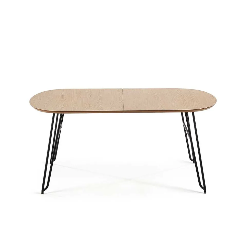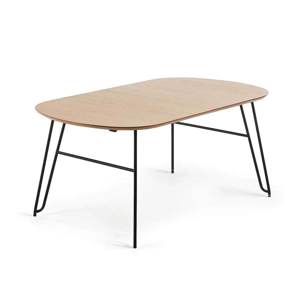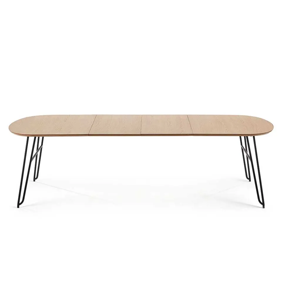 Die ovale Tischplatte aus hochwertigem MDF ist mit einem edlen Eiche Echtholzfurnier versehen und lackiert – für eine angenehme Haptik und langlebigen Schutz. Die etwa 2,5 cm starke Platte wirkt durch ihre aufwendig abgeschrägten Kanten filigran und modern zugleich. Getragen wird sie von einem markanten, aber dennoch dezenten Stahlgestell in schwarzer Haarnadelform. Diese Konstruktion ist nicht nur ein echter Hingucker, sondern auch durch zusätzliche Verstärkungen äußerst stabil – bei einer Belastbarkeit von bis zu 75 kg.