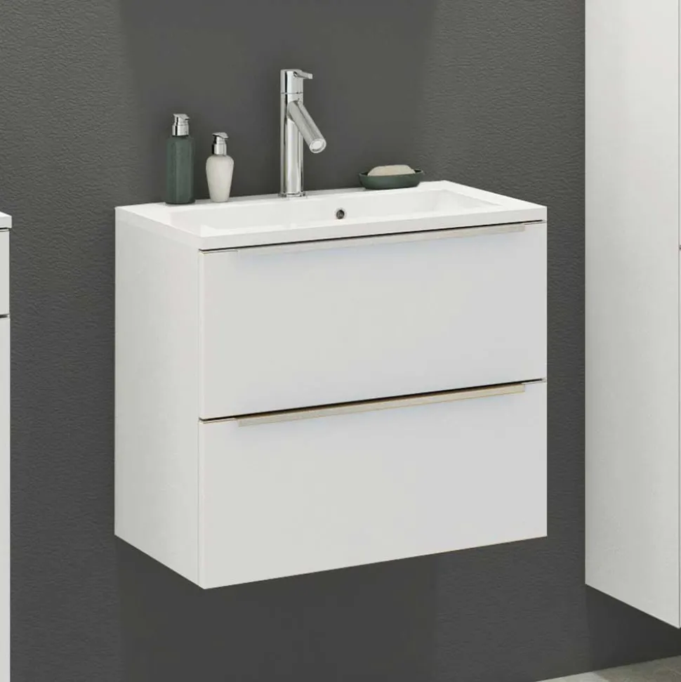 Dezente Metall-Kantengriffe in Edelstahloptik vollenden das elegante Design und bieten eine griffige, funktionale Komponente. Das im Lieferumfang enthaltene, hochwertige Waschbecken ohne Armaturen ermöglicht eine individuelle Gestaltung nach persönlichem Geschmack und Bedarf.
