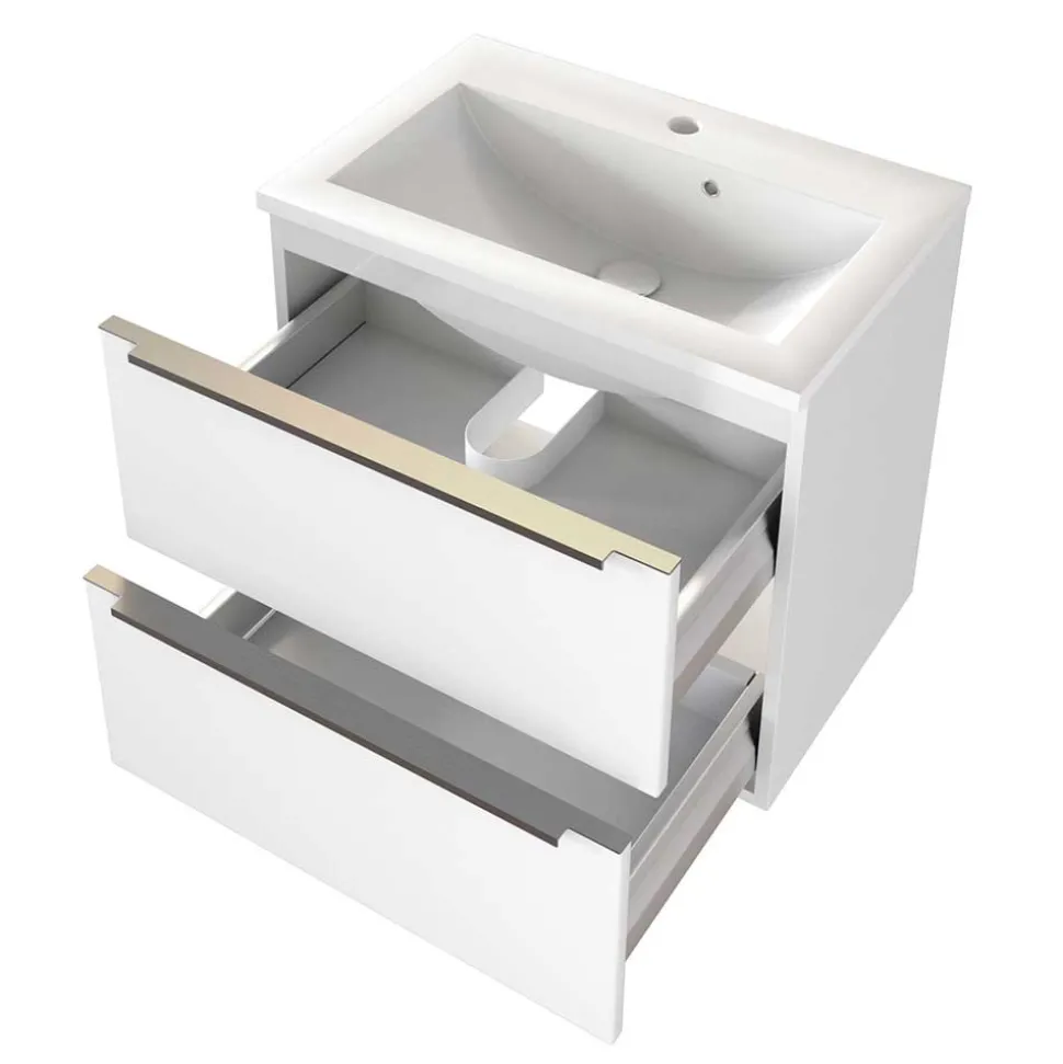 Mit Maßen von 56 cm Höhe und 47 cm Tiefe sowie wählbarer Breite zwischen 60 und 100 cm passt sich der Waschtisch „Livendas“ perfekt an unterschiedliche Raumverhältnisse an. Die Wandmontage spart wertvollen Platz und schafft eine luftige Atmosphäre. Zwei geräumige Schubladen, ausgestattet mit Metallauszügen und einer Soft-Close-Funktion, bieten nicht nur Platz, sondern auch einen leisen und sanften Gebrauch. Der integrierte Siphon-Ausschnitt in der oberen Schublade vereinfacht die Installation und Nutzung.