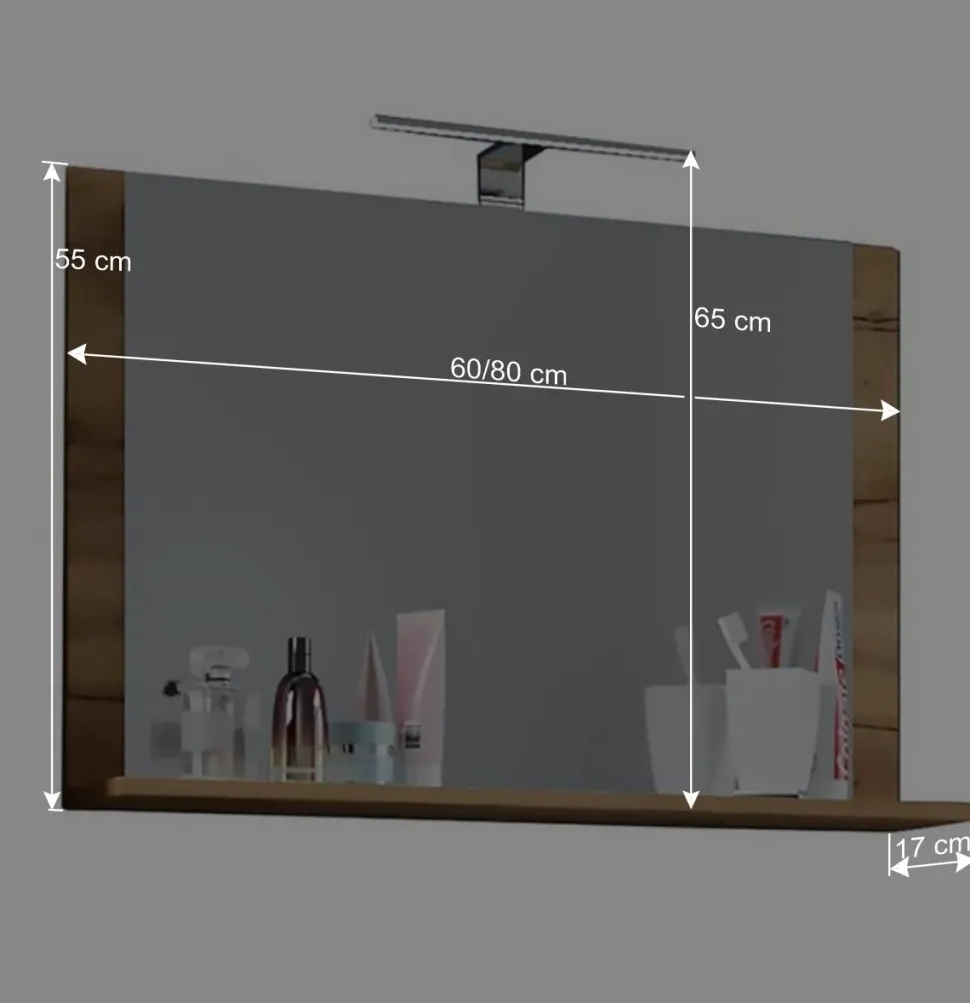 Der Wandspiegel „Toulon“ ist in mehreren Varianten erhältlich – wahlweise mit oder ohne LED-Beleuchtung. Sie können zwischen den Größen 60×55 cm oder 80×55 cm wählen sowie den größeren Ausführungen 60×65 cm und 80×65 cm mit integrierter LED-Beleuchtung. Mit einer Tiefe von 17 cm bleibt der Spiegel angenehm flach und platzsparend, ohne auf Stauraum zu verzichten. Dank der platzsparenden Wandmontage lässt er sich mühelos anbringen – ideal für Bäder, Flure oder Schlafzimmer, in denen jeder Zentimeter zählt.