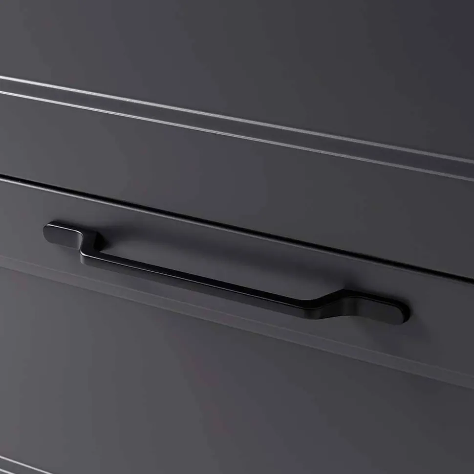 Der Korpus des Schranks besteht aus melaminbeschichteter Spanplatte in Dunkelgrau mit einer natürlichen Holzoptik, die für eine angenehme Haptik sorgt. Die Front aus foliertem MDF ist widerstandsfähig und leicht zu reinigen, während die handlichen schwarzen Metall-Bügelgriffe das Design abrunden. Für zusätzliche Stabilität und Langlebigkeit sorgen die gedämpften Metallbeschläge an der Tür sowie die Metallauszüge der Schublade.