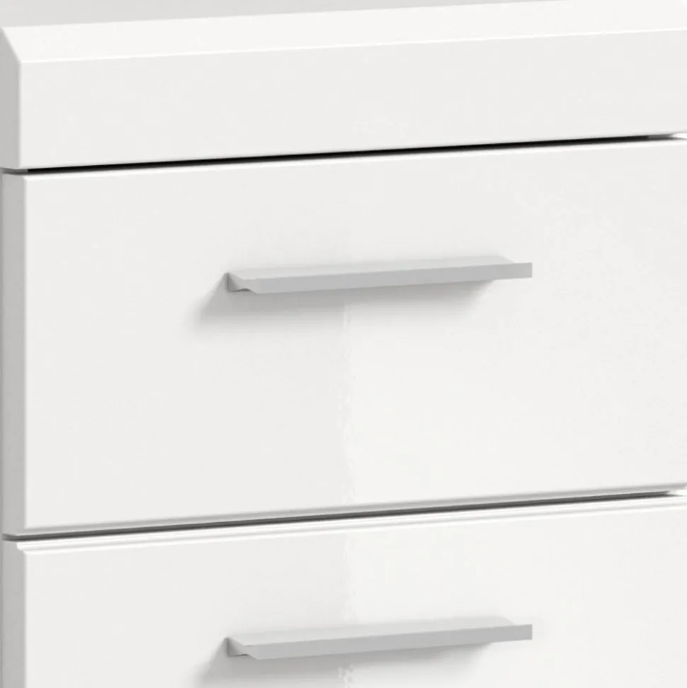 Der Bad-Unterschrank „Henriette“ überzeugt durch modernes Design und clevere Aufteilung. Die weiße Hochglanzfront mit Rillenoptik und silberfarbenen Griffleisten passt harmonisch in jedes Badezimmer und lässt sich ideal mit weiteren Möbelstücken der Serie „Henriette“ kombinieren, die Sie im Wohnen.de Online-Shop entdecken können.