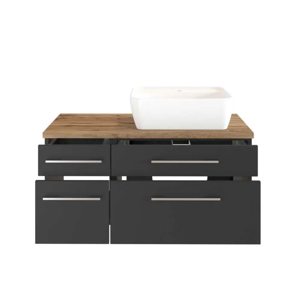 - Korpus in dunkel Grau melaminbeschichtet, Front in dunkel Grau und Deckplatte im Holzdekor Wildeiche foliert