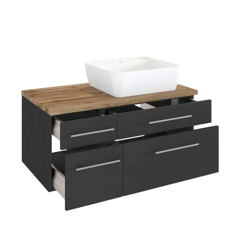 Gefertigt aus robuster MDF für Fronten und Deckplatte sowie aus stabiler Spanplatte für den Korpus, überzeugt der Waschtisch mit Langlebigkeit und Stabilität. Der Korpus ist in dunkel Grau melaminbeschichtet – eine Oberfläche, die widerstandsfähig gegen Feuchtigkeit, Kratzer und Schmutz ist und sich besonders leicht reinigen lässt. Die Front in elegantem dunkel Grau sowie die folierte Deckplatte im Wildeiche-Holzdekor vereinen Ästhetik und Pflegefreundlichkeit. Dank der anspruchsvollen Kantenverarbeitung wirkt das Möbelstück hochwertig und detailverliebt bis ins kleinste Element.